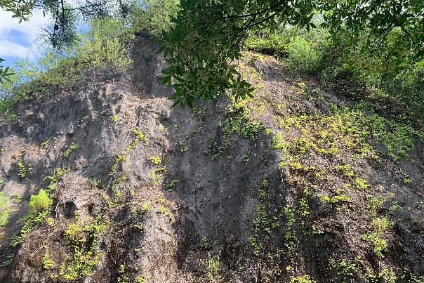 工点1:岩质边坡,局部土石混合。2013年边坡发生失稳破坏,导致沥青路面(2012年白改黑)被掩埋,交通中断。后面经抢修(将滑塌到路面堆积物用推土机推到道路另一侧(临空侧))恢复交通,并对该边坡进行治理,考虑到地质条件相对较好,采用的是素喷混凝土加钢筋网片的方式对边坡进行治理,主要是防止水进入坡体对边坡产生不利影响,但由于边坡较陡,植被难以生长,因此,边坡上基本无植被生长。相对来说这个边坡是比较稳定,治理后一直稳定到现在。