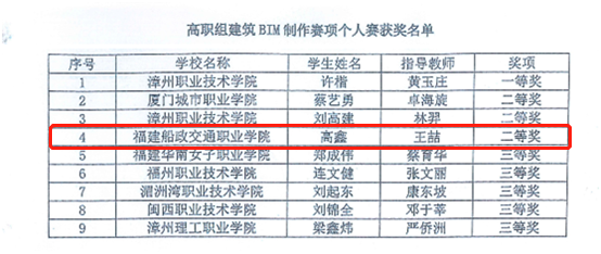 2022年11月19日,第九届海峡两岸暨港澳大学生职业技能大赛“建筑BIM制作”赛项(高职组)在福建省漳州职业技术学院举行。因疫情原因,本项赛事通过线上竞赛的形式进行,全国26所高校共计75名选手晋级本项赛事的决赛阶段。我院两位选手的作品晋级本项赛事的决赛阶段,其中选手20级建筑工程技术专业高鑫同学及其模型制作团队完成的作品在王喆、高巧玲等BIM教师团队指导下以及航海学院江金春、蔡克豪老师的帮助下,取得了全国第4名的成绩,荣获二等奖,刷新了我院参加该项赛事以来的最好成绩。