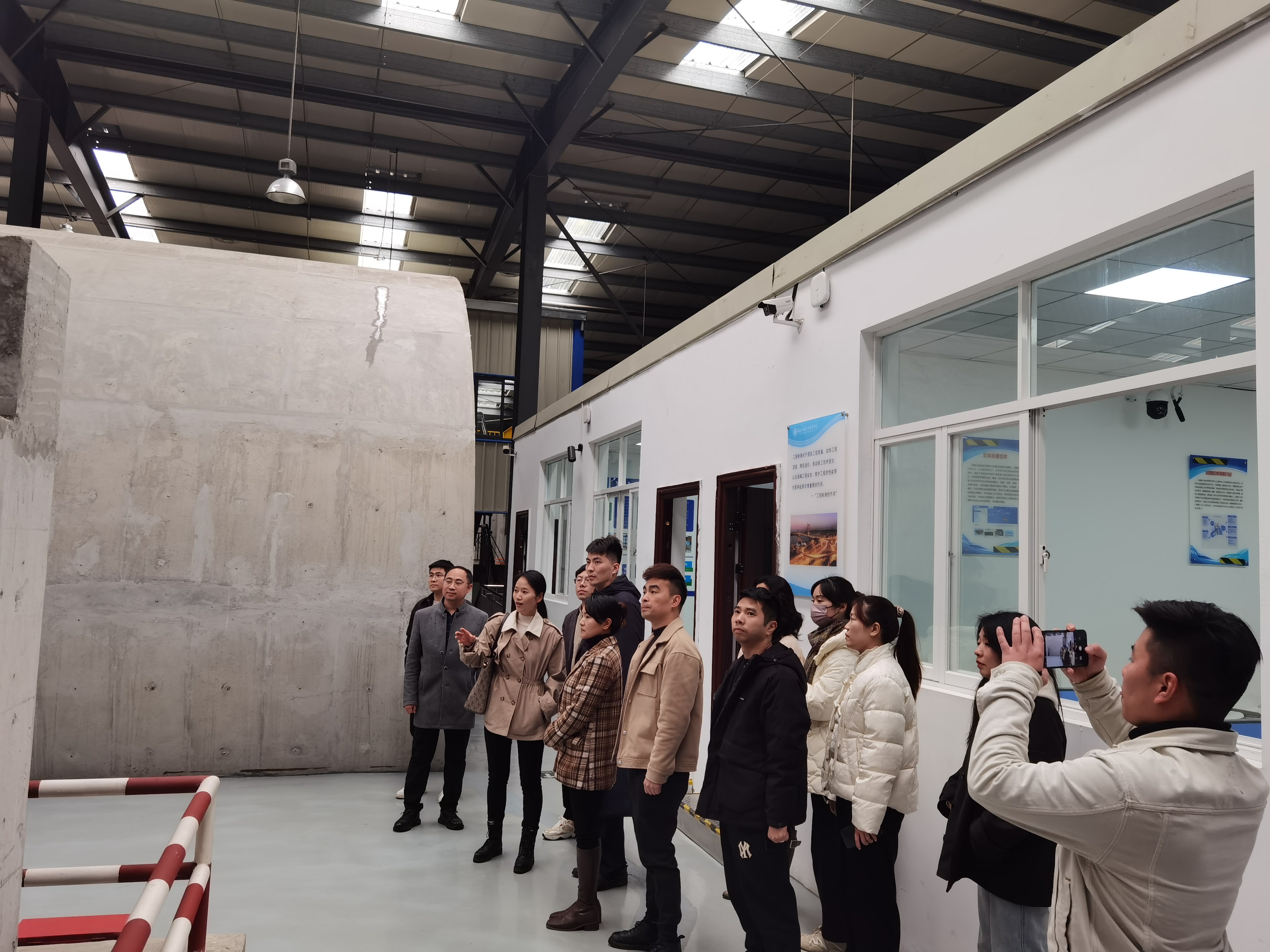 在交流活动中,仓山镇人民政府一行首先参观了智慧检测实景实训基地,进入施工馆,详细了解了基坑、边坡、建筑等1:1等比例实体模型及文明工地实物沙盘系统等,对学院的工程实体构造及施工工艺流程有了更直观的认识。林晞楠对学院在这一领域的建设成果表示高度赞赏,认为这体现了学院在产教融合、科教融汇方面的创新实践,为双方未来的合作奠定了坚实基础。