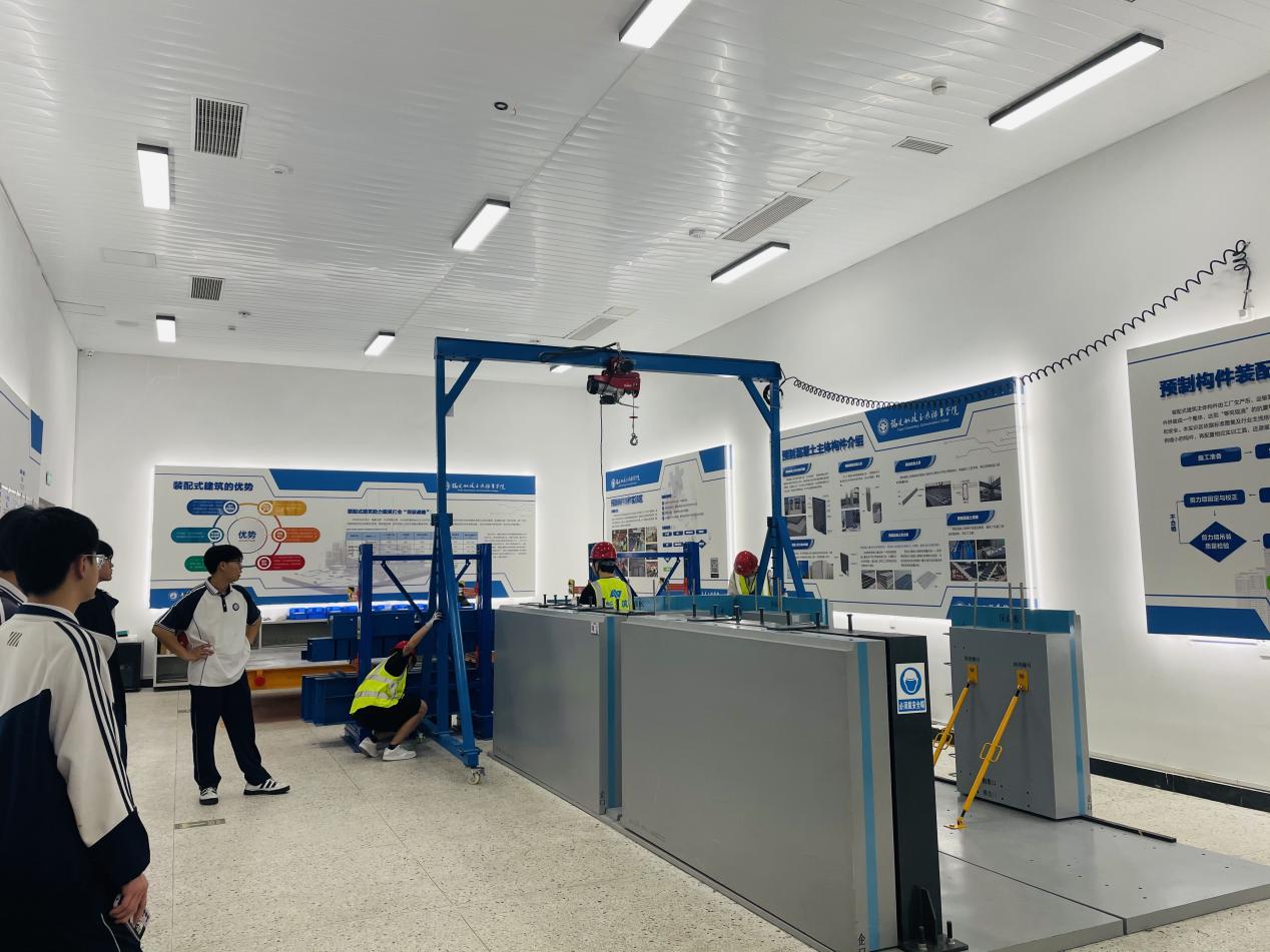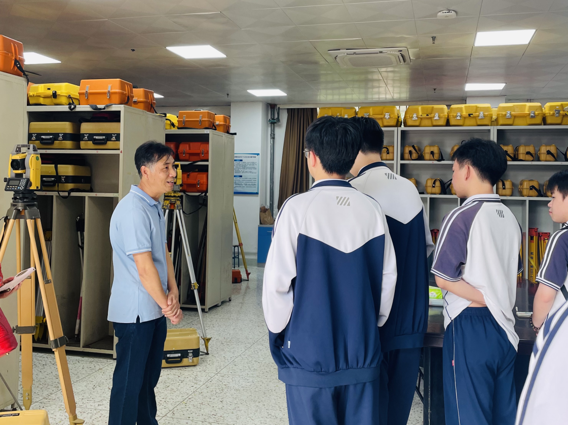 随后学生分组参观实验(训)室,先后参观了常规/精密工程测量实训基地、建设工程虚实结合实景教学实训基地、智慧检测基地、装配式实训基地等。实训指导老师对实训设备和实验仪器进行展示和解说,学生通过直观体验观摩,产生浓厚的兴趣,对未来职业发展充满期待与向往。