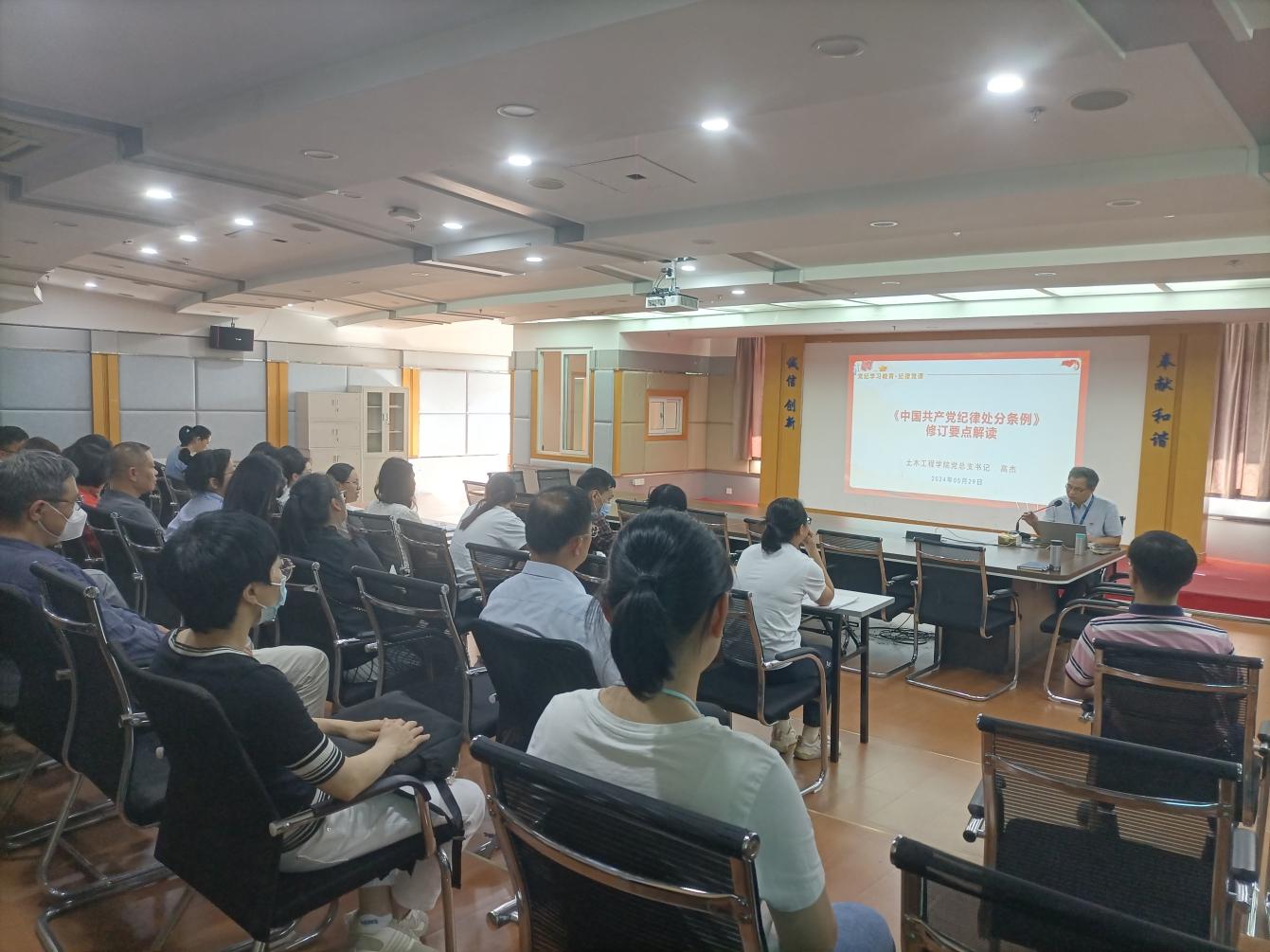 2024年5月29日下午,为深入学习贯彻习近平总书记关于党纪学习教育的重要讲话精神和重要指示精神,引导党员干部增强纪律意识,做到学纪、知纪、明纪、守纪,土木工程学院党总支在创新楼1007开展党纪学习教育集体学习暨党总支书记上专题党课活动,党总支书记高杰同志围绕“《中国共产党纪律处分条例》(以下简称《条例》)修订要点解读”,结合学习理解感悟,为学院全体党员作党纪学习教育专题党课。