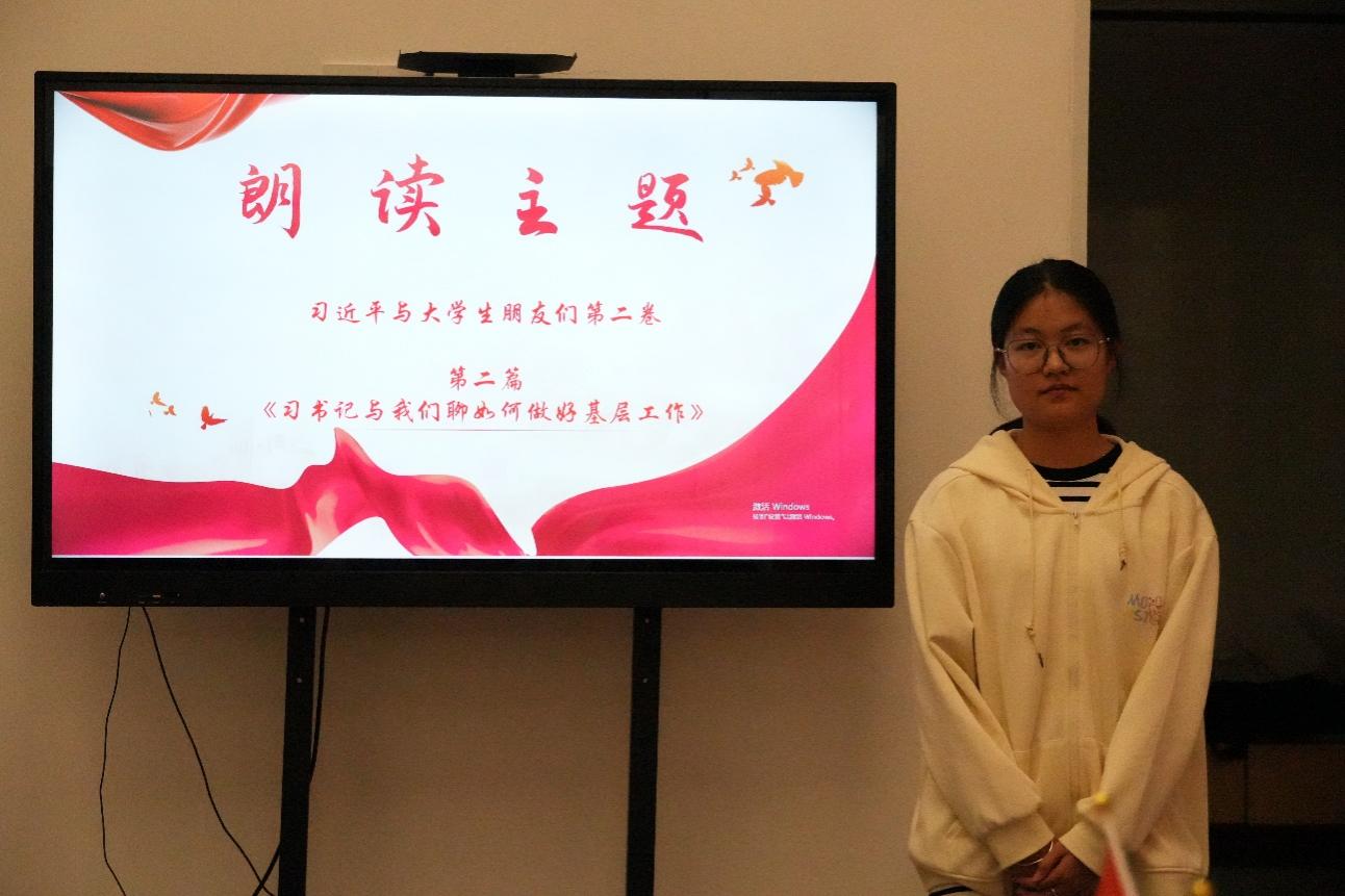 分享会上,2023级建筑装饰工程技术2班组织委员柳慧欣,领学朗读了,《习近平与大学生朋友们》第二卷第二篇《习书记与我们聊如何做好基层工作》,从中我深切地感受到了习近平总书记对于基层工作的极度关注以及他对年轻学生们的深深关怀。