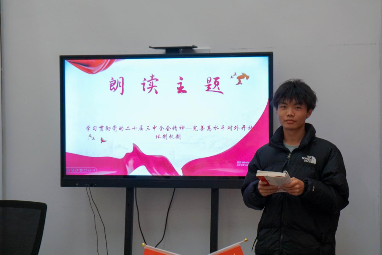 分享会上,2024级道路与桥梁工程技术1班团支书林雨涵,领学朗读了《中共中央关于进一步全面深化改革、推进中国式现代化的决定》(后文简称《决定》)“完善高水平对外开放体制机制”部分。