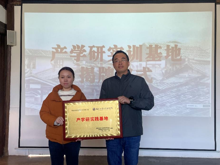 随后,双方举行了签约仪式与揭牌仪式。永泰县嵩口镇组织委员鄢美凤与土木工程学院朱明栓副院长代表校地双方签署合作协议,并共同为“产学研实训基地”揭牌。