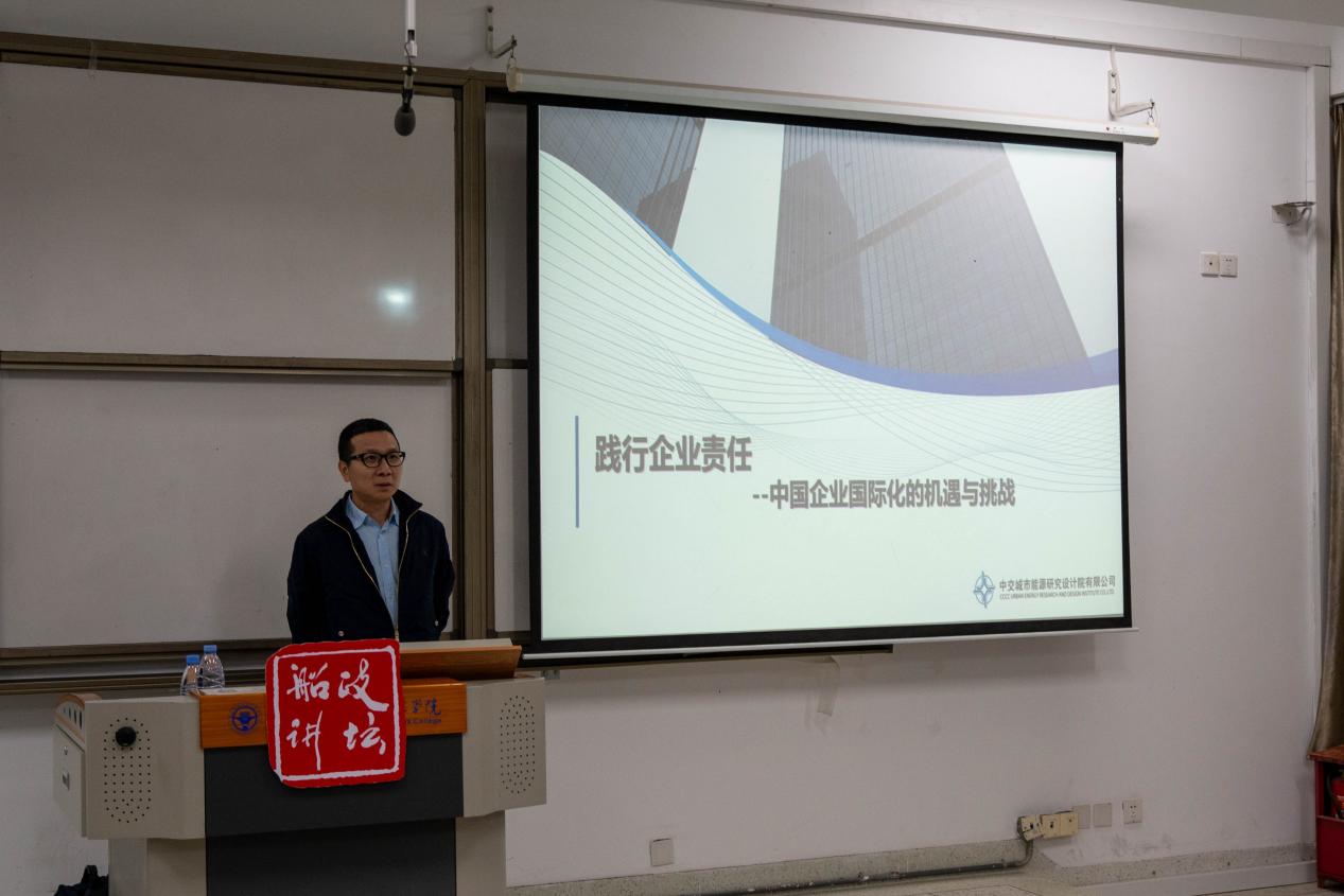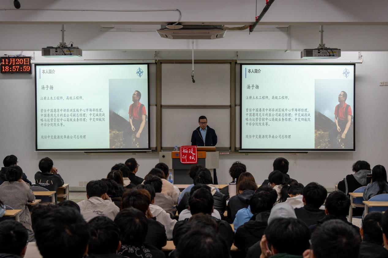 在经济全球化深入推进、中国企业“走出去”步伐加快的背景下,为帮助同学们了解国际市场的规则、文化与竞争环境,最终实现可持续的跨国发展。2025年11月20日,土木工程学院在福船园创新楼301开展“践行企业责任——中国企业国际化的机遇与挑战”主题讲座。本次讲座特邀中交能源院华南公司总经理、注册土木工程师汤子扬高级工程师主讲,近百名学子齐聚现场,共同探寻中国工程企业“走出去”的奋斗之路与发展之道。