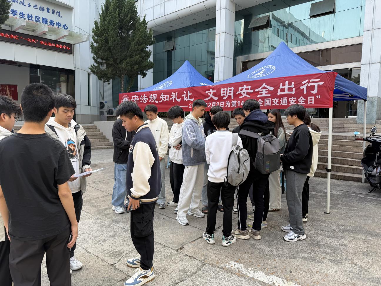 为深入贯彻落实交通安全相关法律法规,切实增强学生的交通安全意识、提升文明出行素养。2025年12月2日,在第14个“全国交通安全日”来临之际,土木工程学院于福航园“一站式”学生社区服务中心开展以“守法规知礼让,文明安全出行”为主题的交通安全宣传教育活动。