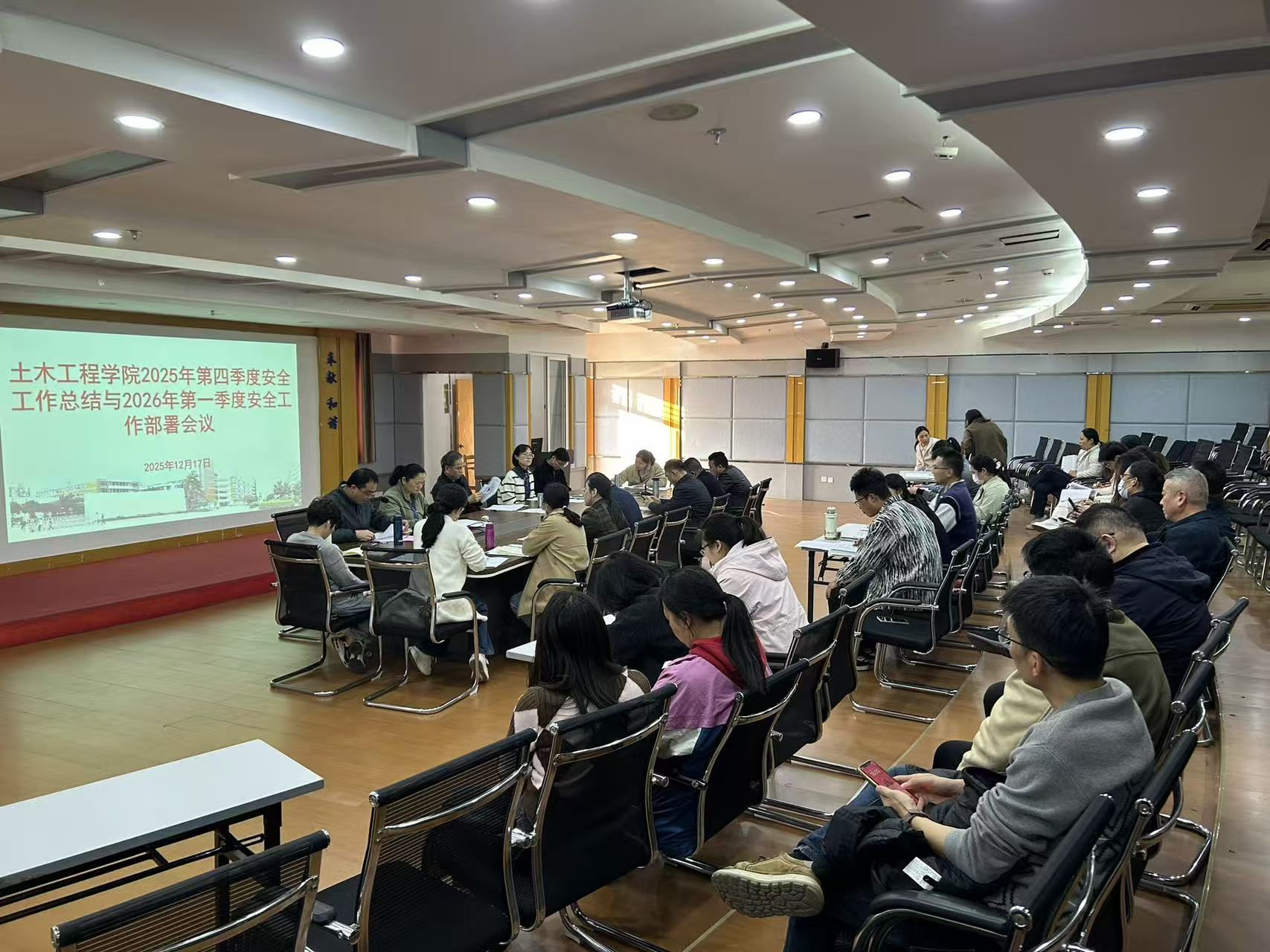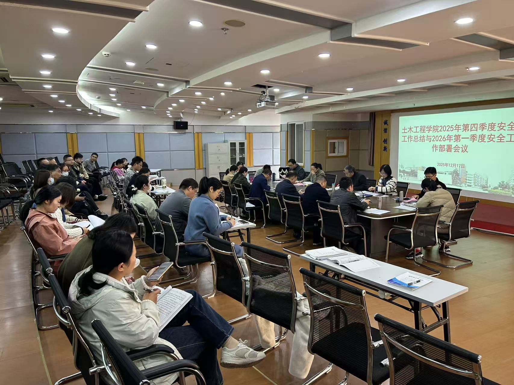 12月17日,土木工程学院在创新楼1007会议室召开2025年第四季度安全工作会议,总结年度及第四季度安全工作情况,分析当前面临的安全形势与风险点,并对岁末年初及下一阶段安全重点工作进行部署。学院领导班子成员、组织员、教研室主任、办公室人员、全体实训中心成员及辅导员参加会议。会议由土木学院副院长朱明栓主持。