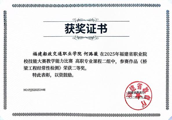 依托国-省-校级科研平台体系,在教科研上取得丰硕成果。组建多专业、多技术集成的科研团队,在交通基础设施安全运维、智慧检测监测、无人机 应用、绿色新材料等领域,开展横纵向科研项目300余项,获得专利80余件,出版专著2部,编制标准和指南15部,获福建省科技进步奖2项。连续6年受福建高速集团委托,完成全省4.5万公里全路段病害数据处理。受省住建厅委托成立福建省乡村振兴服务中心,开展乡村工匠培训、古厝保护、农村公路拓宽、安全治理等帮扶指导和公益性技术支援,打造服务乡村振兴示范样板;将道桥预防性养护、智慧运维等科研成果融入专业教育,建成道路与桥梁工程技术专业省级专业教学资源库、省级精品课程20门、出版教材20余部,其中国家规划教材6部。坚持“以赛促学、以赛促教、以赛促改”指导学生参加各类竞赛,获得国家级奖项34项、省级奖项75项。深化“岗课赛证”融通,探索“岗课”衔接、“课赛”联通、“课证”融合机制,实现“岗课赛证”融入专业人才培养全过程。