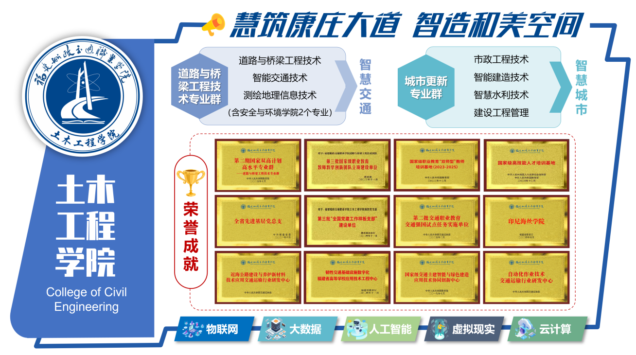土木工程学院是全省重要的交通工程建设与管理高技能人才培养基地,道路与桥梁工程技术专业群入选第二期国家双高计划高水平专业群。现有国家级职业教育教师创新团队、国家级交通土建智能与绿色建造应用技术协同创新中心、国家级职业教育“双师型”教师培训基地、国家高等职业院校创新行动计划校企共建生产性实训基地、交通部自动化作业技术交通运输行业研发中心、交通部近海公路建设与养护新材料技术应用交通运输行业研发中心,以及韧性交通基础设施数字化福建省高等学校应用技术工程中心,承担交通运输部第二批交通职业教育交通强国专业试点任务。自1974年开办以来,已为行业输送超2万名交通土建类相关专业毕业生,为服务交通强国战略,加快建设交通强国福建先行区,推动福建建设交通强省、构建海峡两岸融合发展示范区和全国首批公路数字化转型升级示范区提供人才支撑。