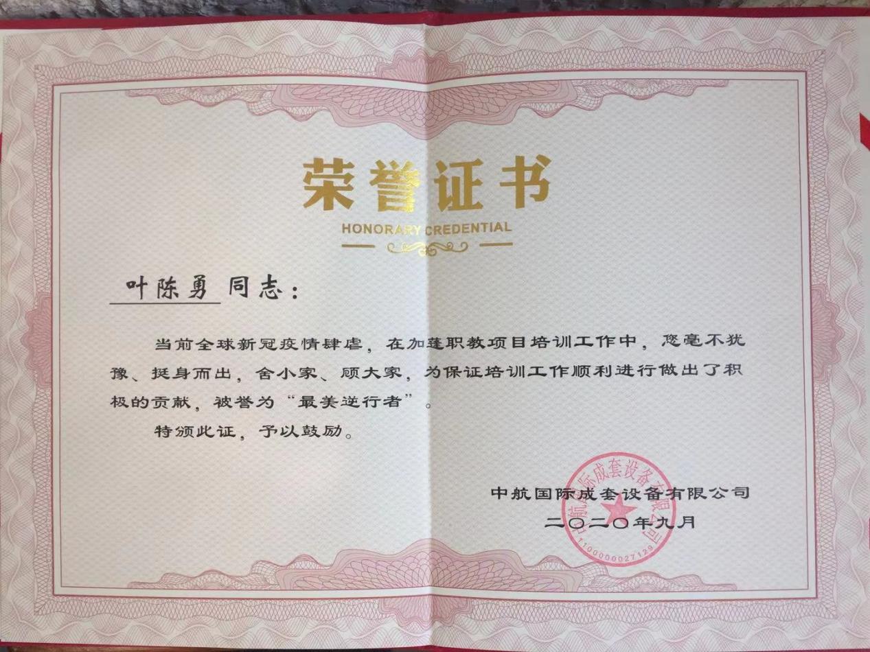 (四)2020年9月被中航国际成套设备有限公司授予最美逆行者称号