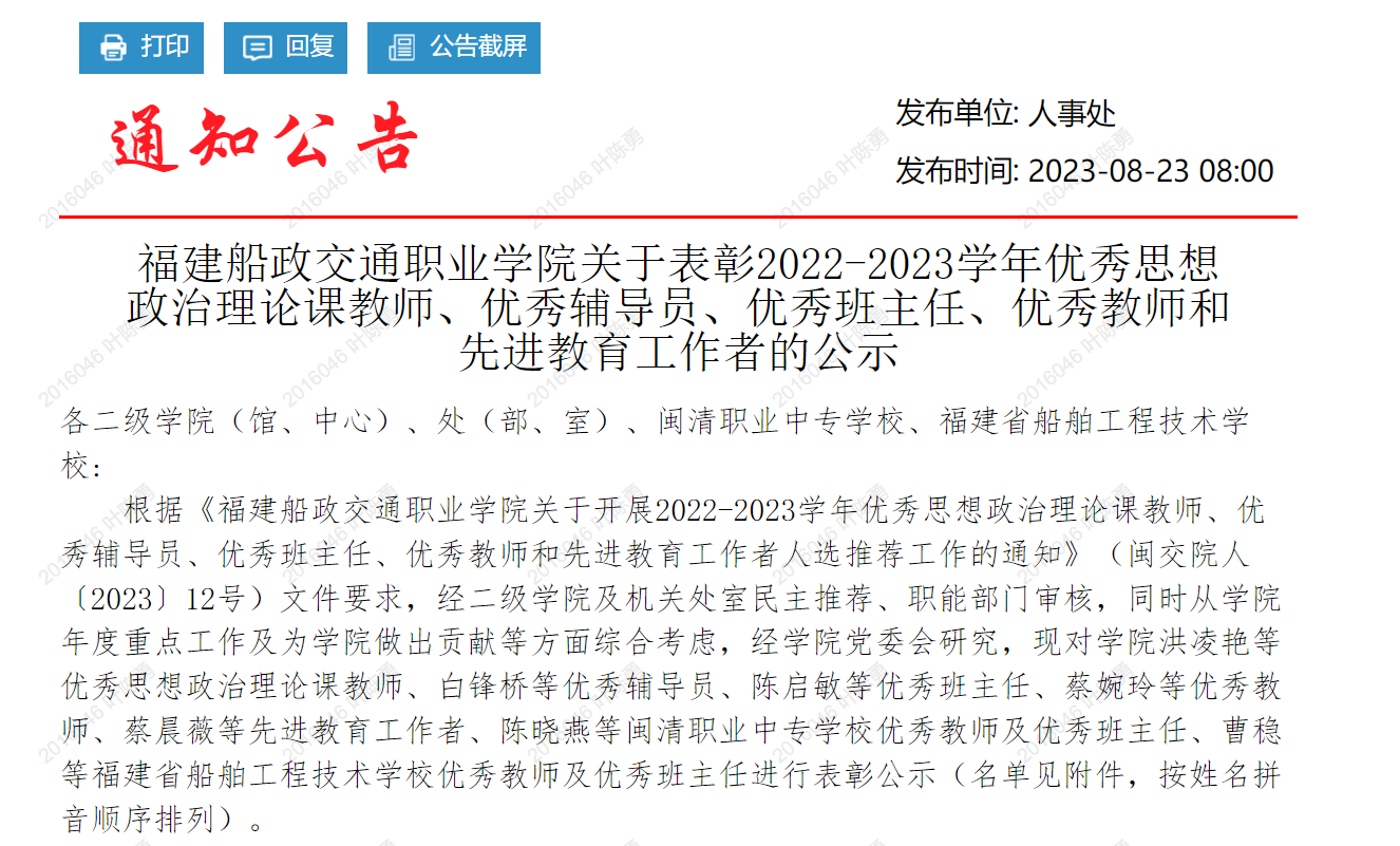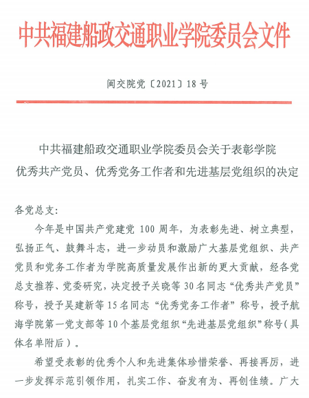 (八)2019-2023年被福建船政交通职业学院授予五四青年奖章、优秀共产党员、优秀教师、优秀教育工作者