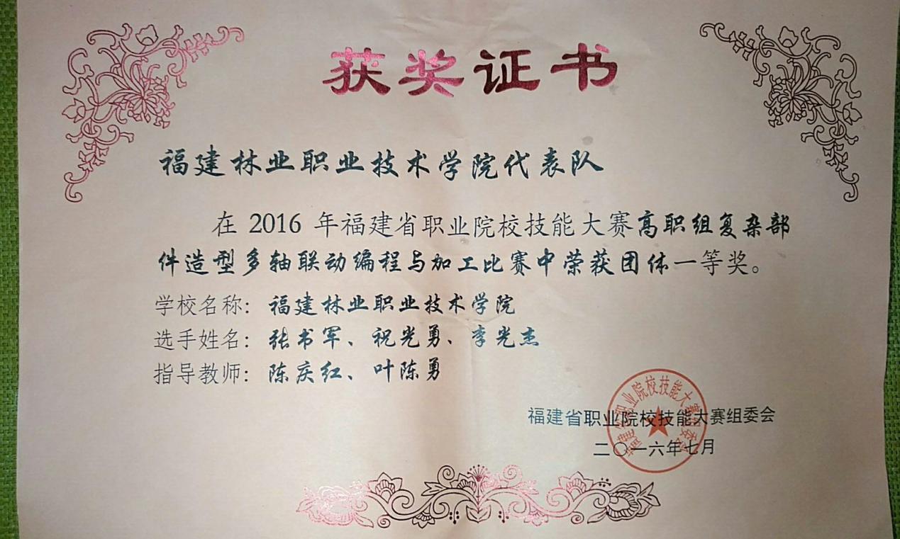 (七)2016年7月被福建省职业院校技能大赛组委会评为福建省职业院校技能大赛高职组复杂部件造型多轴联动编程与加工团体一等奖指导教师
