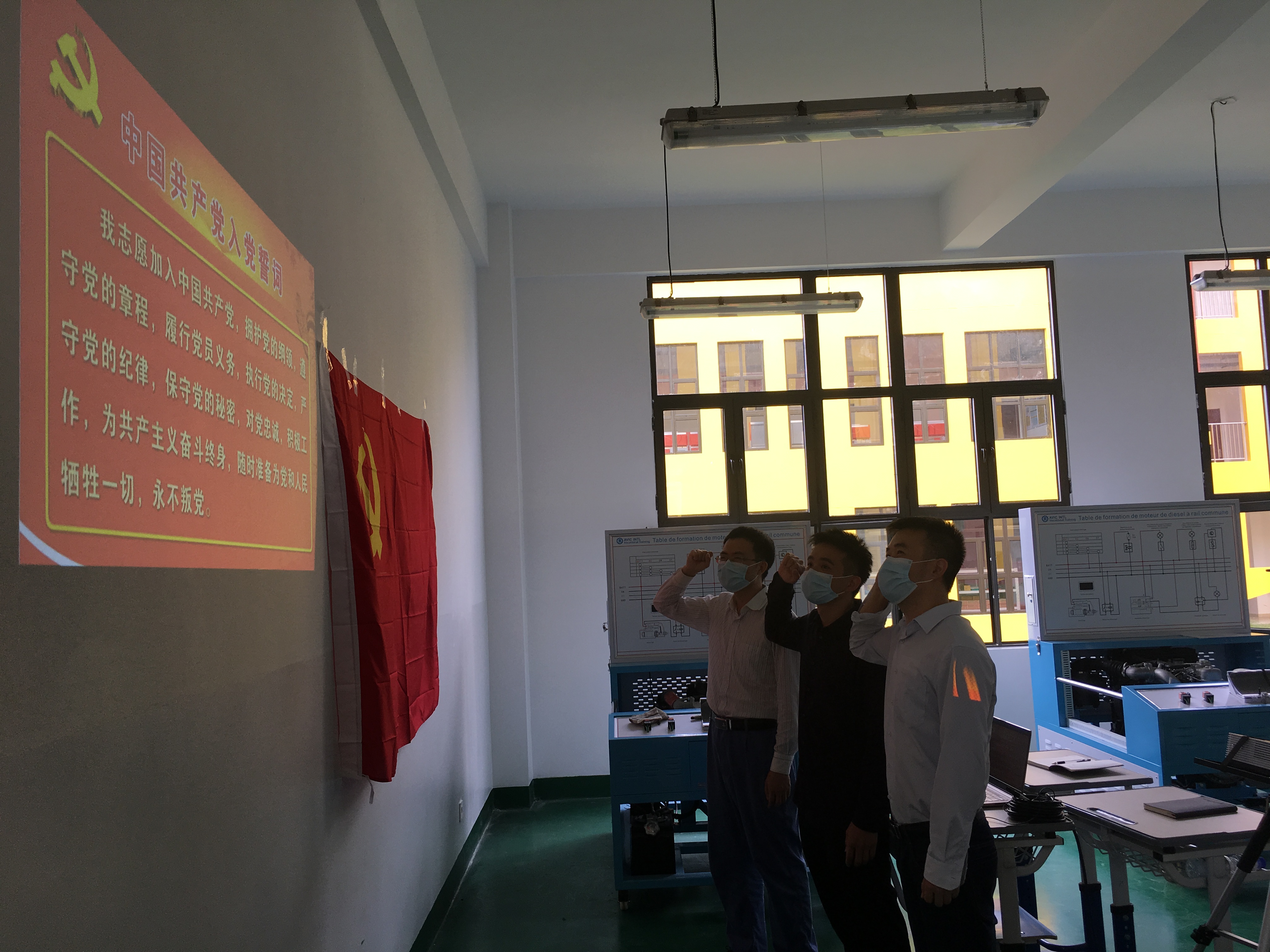 2020年8月21日,我清楚的记得那一天,当我接到加蓬职教项目的任务时,尽管耳边有家人提醒的“危险”,有朋友叮嘱的“艰难”,有怀着孕妻子的担忧,但 内心更多的却是一股年轻人的冲劲,一股不服输、想去拼、不给组织掉链子的冲劲,我没有丝毫的退却。然而当我真正到了非洲驻地的时候,眼前的一切却让我同事们顿时傻了眼,我们即将工作的职教中心还是一片施工地,接踵而至的加蓬疫情病例人数成倍增长,4位同事感染新冠,2名学员、2名翻译得了疟疾高烧昏迷,附近中国饭店夫妻被劫杀,身边同事在驻地被毒蛇咬伤,同事的电脑被盗……突发事件让周围环境充满恐惧和压抑。此时的我想起怀孕的妻子、年幼的孩子,想起临行前,党组织交给的党旗,我和同事们组成临时党小组,重温入党誓词,铿锵有力的入党誓词句句千钧,激发起我们强烈的荣誉感、责任感和使命感,我们用信念替代内心的焦灼,初心如磐。