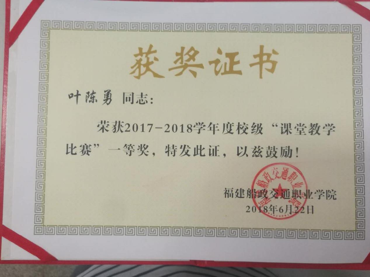 (九)2017-2020年连续被福建船政交通职业学院评为校教学能力比赛一等奖、二等奖。