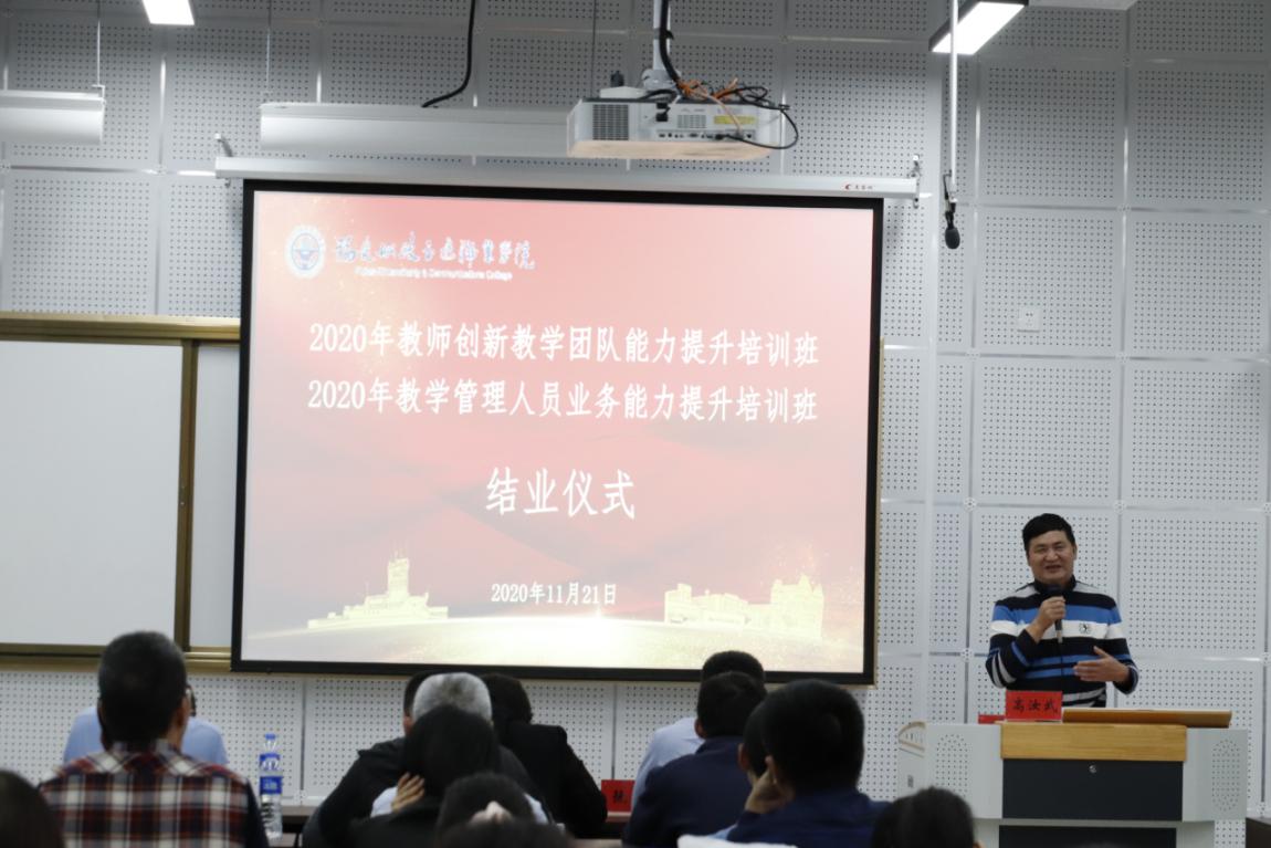 最后培训班各组对此次培训进行分组总结汇报,高汝武副校长做总结发言,他对此次培训的效果充分肯定,对参加培训的教师提出殷切要求。通过举办教学创新教学团队能力提升培训班,促进高水平结构化团队建设,提高学校“双师型”教师队伍建设水平,深化学校教师、教材、教法“三教”改革,为“双高建设”、模块化教学改革、课程思政等师资建设提供有力支持。