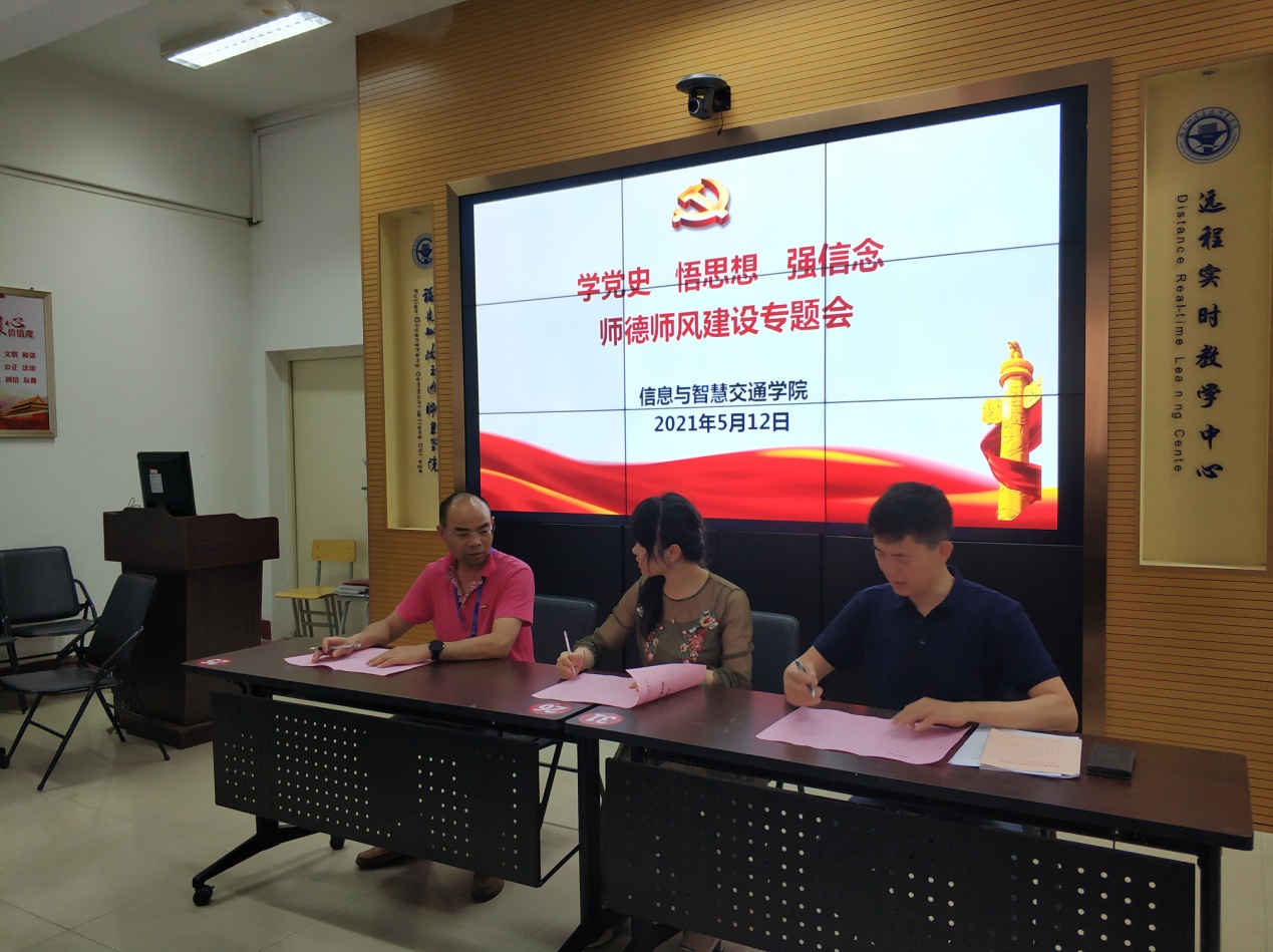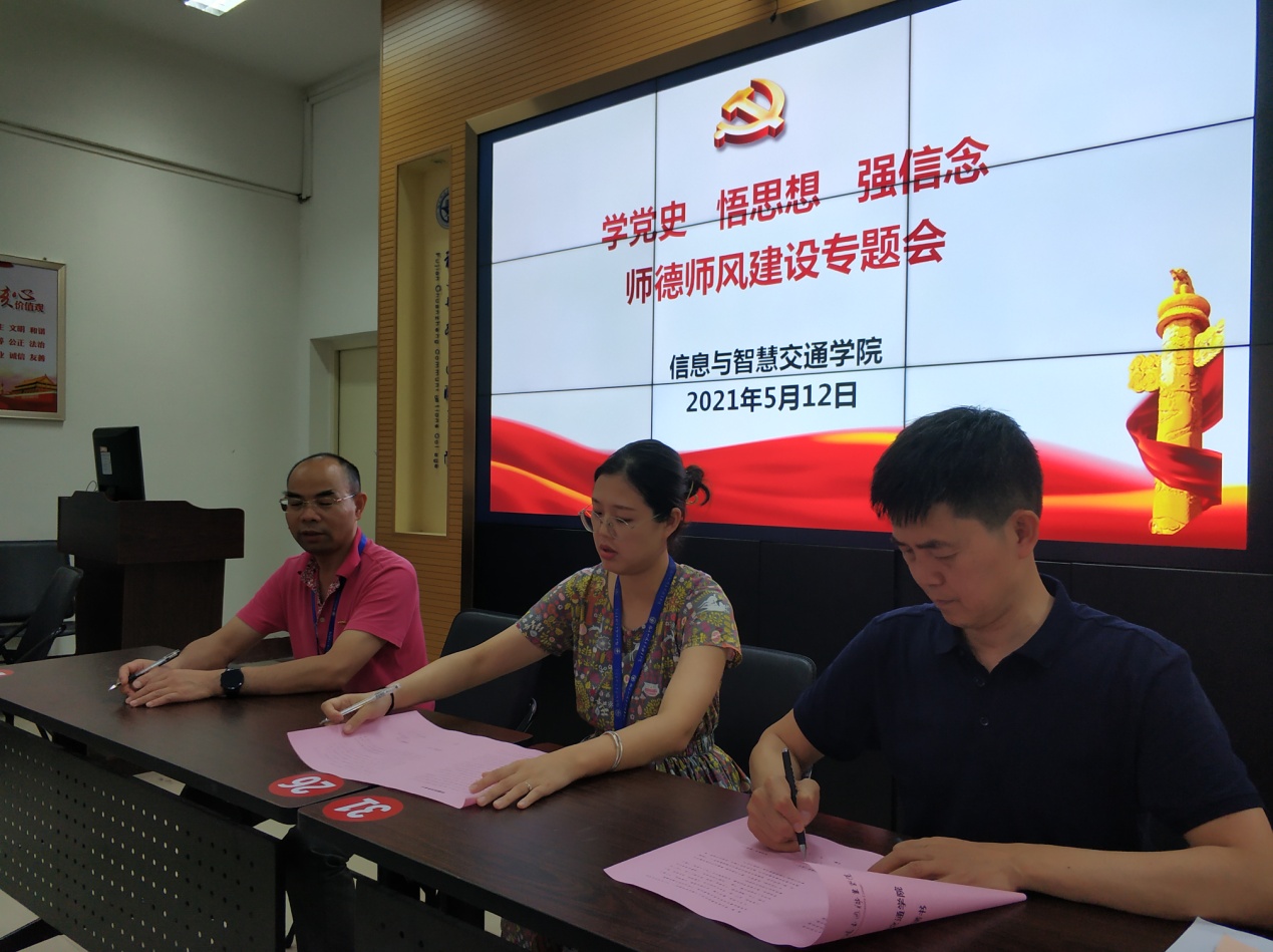 会上,学院总支书记许友孝带领全体老师们认真阅读了《信息与智慧交通学院师德师风承诺书》的各项内容,强调坚决不触碰师德红线,做一个遵守纪律的老师。最后每位老师郑重地在《信息与智慧交通学院师德师风承诺书》上签下了自己的名字。