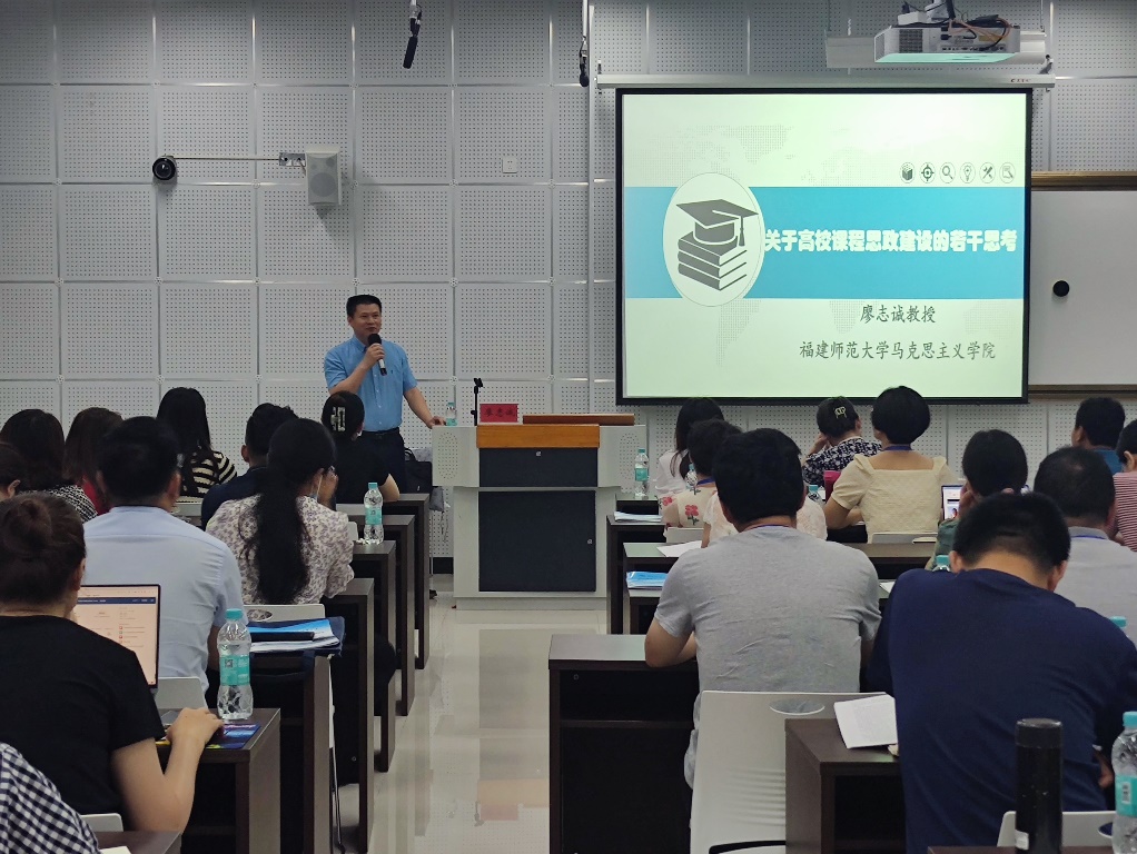 福建师范大学马克思主义学院教授、法学博士、硕导、思想政治教育专业硕士点学科带头人廖志诚以《关于高校课程思政的若干思考》为题,为大家厘清了课程思政的内涵释义,阐明了高校课程思政建设的重要意义,指引学员们如何充分发挥课程思政的育人作用,并做课程思政的课例实践展示。