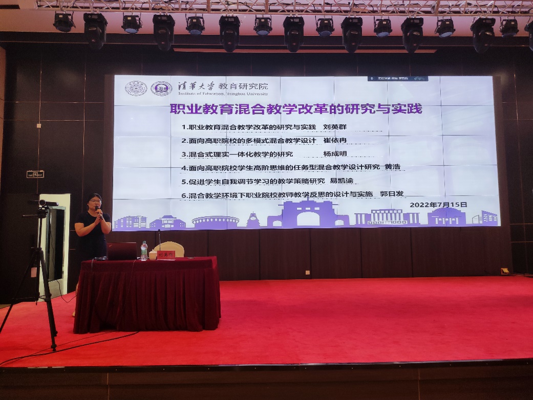 清华大学计算机科学与技术博士,清华大学教育研究院教育技术研究所高级工程师刘英群率团队围绕《职业教育混合教学改革的研究与实践》专题,分析在职业教育数字化转型背景下,职业院校混合课程如何开展教学实践和系统化研究。崔依冉、杨成明、黄浩、易凯谕、郭日发几位成员分别就《面向高职院校的多模式混合教学设计》《混合式理实一体化教学的研究》《面向高职院校学生高阶思维的任务型混合教学设计研究》《促进学生自我调节学习的教学策略研究》《混合教学环境下职业院校教师教学反思的设计与实施》分享了其团队的研究成果。