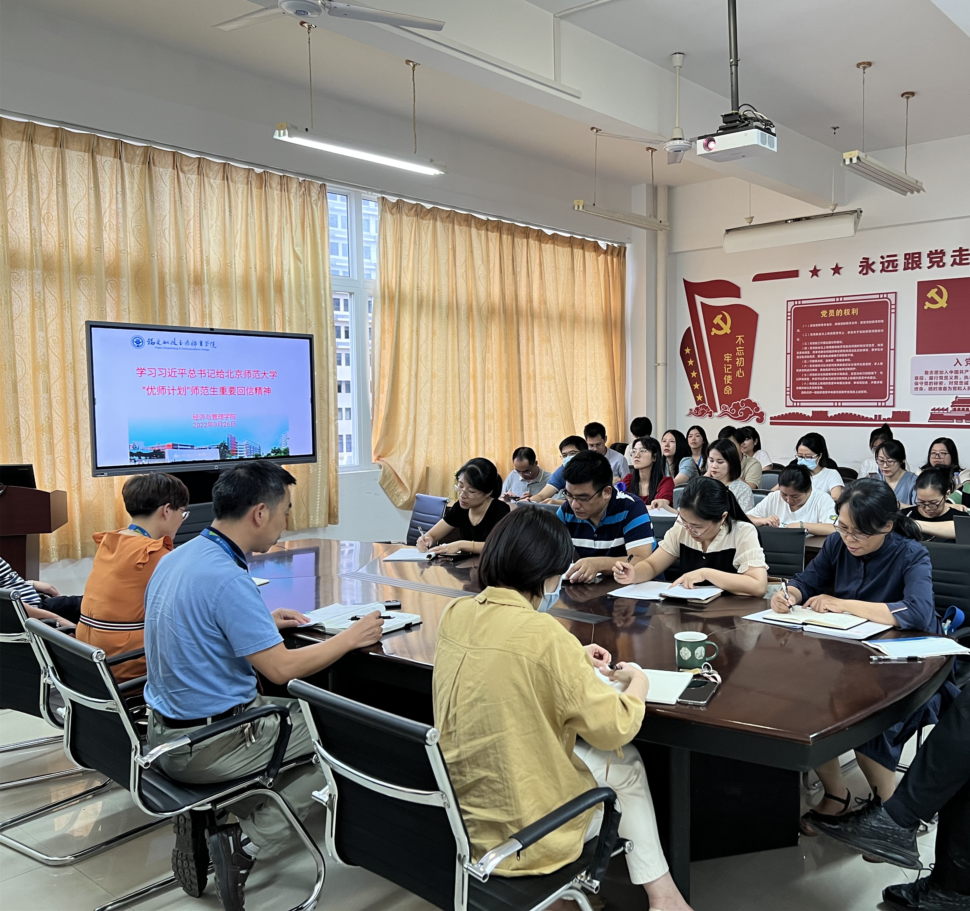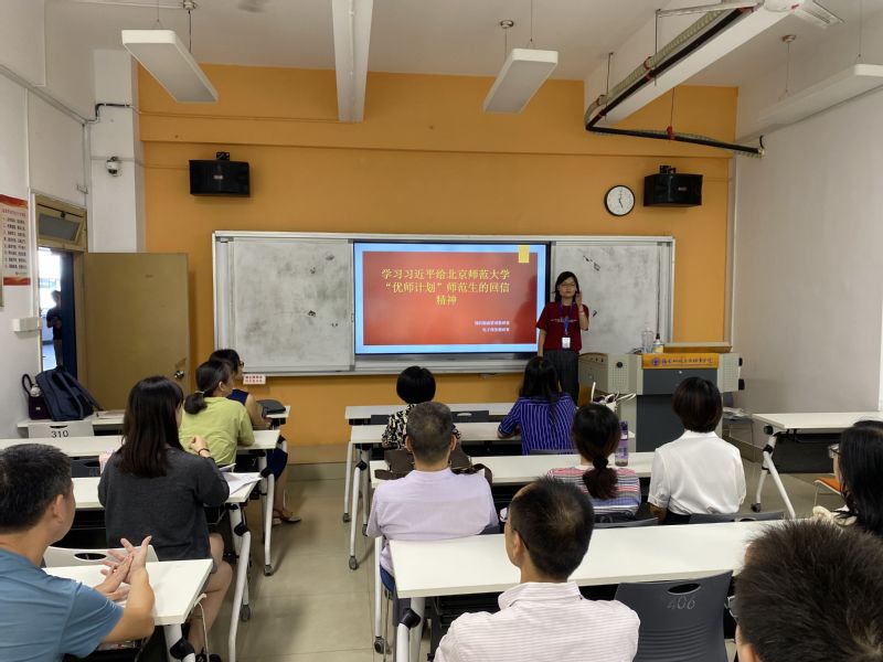 学习会上,俞素平书记带领全体与会教师学习了习近平总书记给北京师范大学“优师计划”师范生重要回信内容,并观看了专题片《习近平的教师情》。