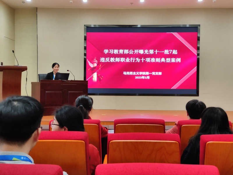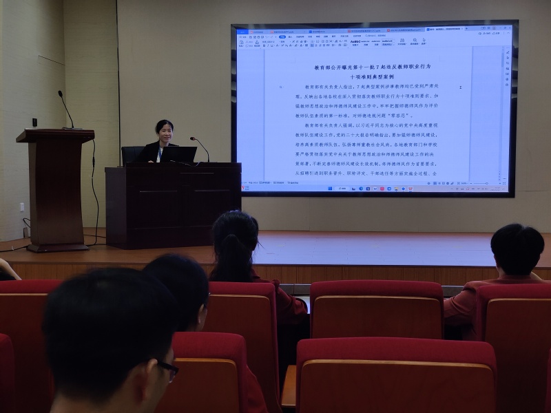 省级样板支部马克思主义学院第一党支部书记洪凌艳领学《教育部公开曝光第十一批7起违反教师职业行为十项准则典型案例》。以生动详实的案例、通俗易懂的语言,对全院教师加强警示教育,希望大家警钟长鸣,引以为戒,共同营造“风清气正”的师德师风氛围。