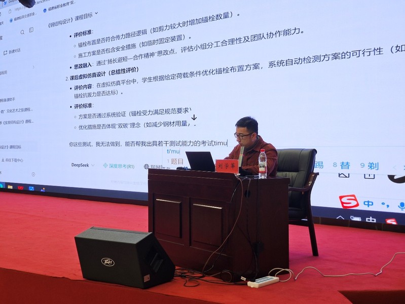 刘学莘教授围绕教学目标、学情分析、教学问题、课堂创新、考核评价等五个维度深入讲解借助DeepSeek等AI技术优化教学设计的路径和经验,并现场演示如何利用DeepSeek精准提炼教学目标、构建动态学情画像、定位教学重难点等,现场教师踊跃跟随操作。