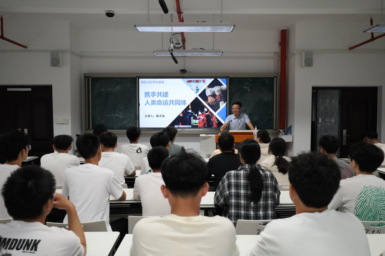 陈天炎院长分别从伟大构想应时顺势、鲜明旗帜广泛认同、中国行动彰显担当、命运与共前景可期四个部分进行了讲解。并通过引入新冠肺炎疫情、世界发展面临的难题等例子,为同学们阐述了构建人类命运共同体的必要性、构建人类命运共同体面临的挑战、构建人类命运共同体面临难得机遇。