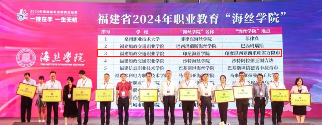 近期,由福建教育厅、省委宣传部、省委网信办、省人社厅等10部门联合主办、泉州职业技术大学承办的2024年职业教育活动周省级主会场活动在泉州晋江举办,活动周启动仪式上公布了福建省第一批20个“海丝学院”,我院“印尼海丝学院”入选并现场获得授牌。