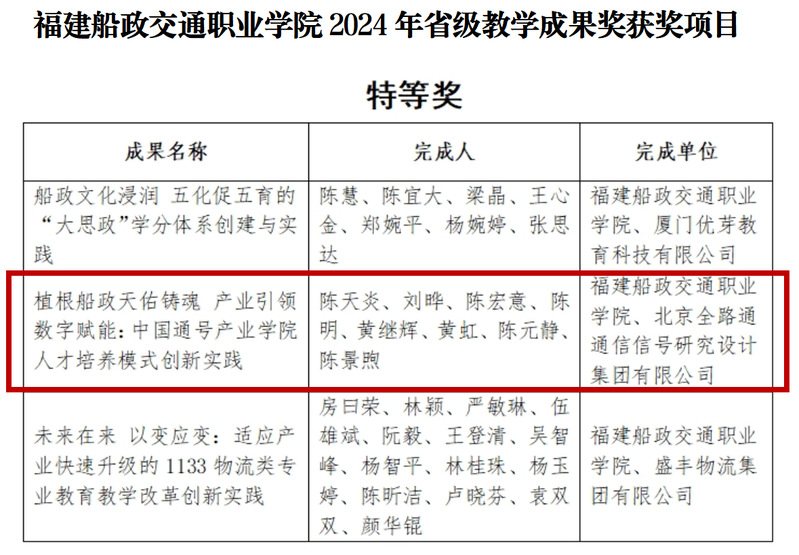 近日,2024年福建省教学成果奖评选结果公布,我院陈天炎教授领衔申报的《植根船政天佑铸魂 产业引领数字赋能:中国通号产业学院人才培养模式创新实践》荣获职业教育省级教学成果奖特等奖。