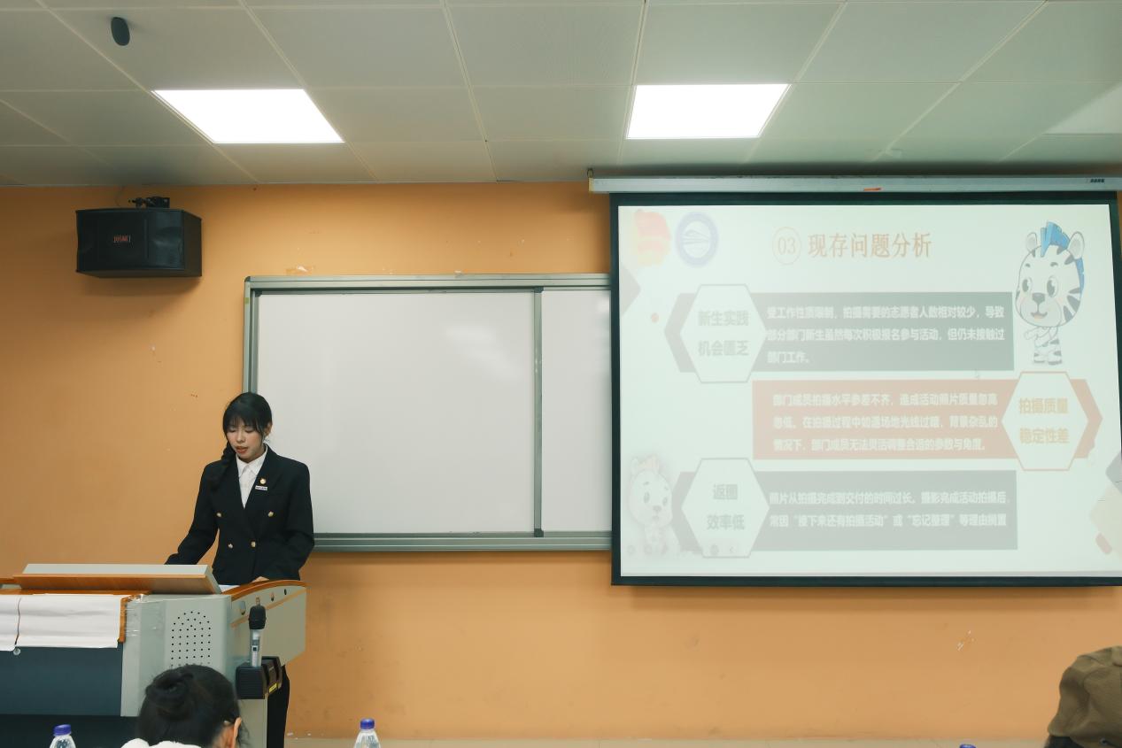 组织部部长吴艳婷针对团组织关系转接率问题进行了深入分析,并制定有效的解决方案。社团部部长李雾昕阐述各类社团活动的开展与落实,同时剖析学生积极性不足等问题。志愿者工作部部长陈悦系统梳理部门的工作内容,全面展示活动开展成效。还从活动中梳理现存不足,针对性的整提交改方案。