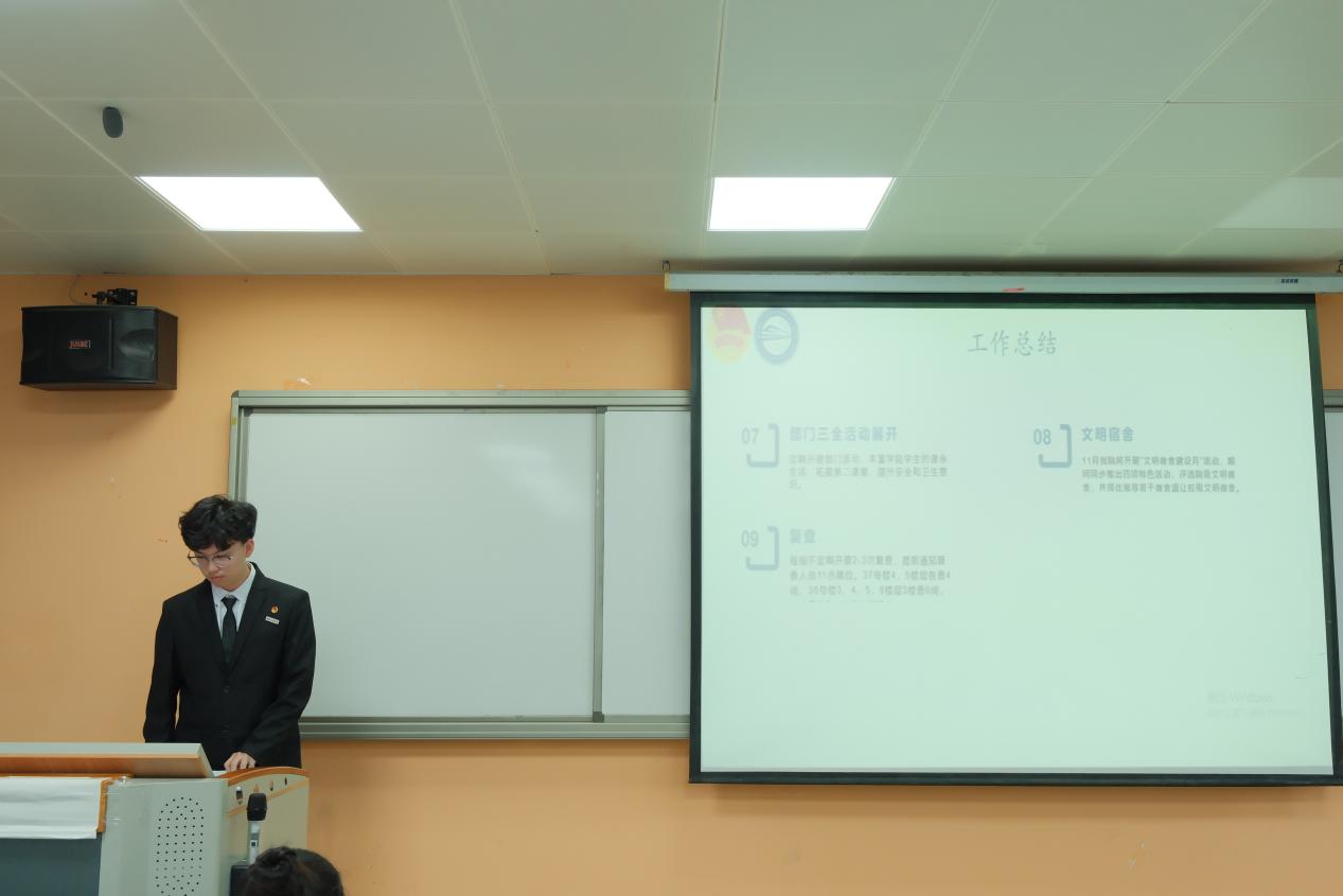 大学生自律委员会主席高鹏以图文结合的形式,清晰展现考勤督查、纪律管理等学生日常事务开展情况,并梳理出工作中的问题与疏漏,提出合理的改进措施。红十字会学生会分会会长陈妍冰详细汇报公益活动开展与部门运营工作,深入剖析机构式培训、活动策划等方面存在的不足,进行未来工作规划。