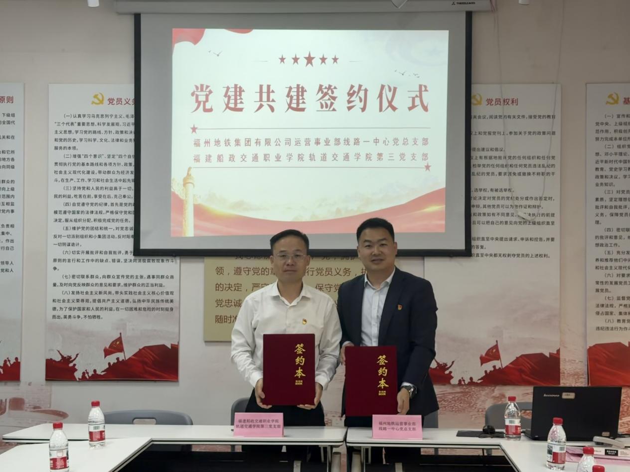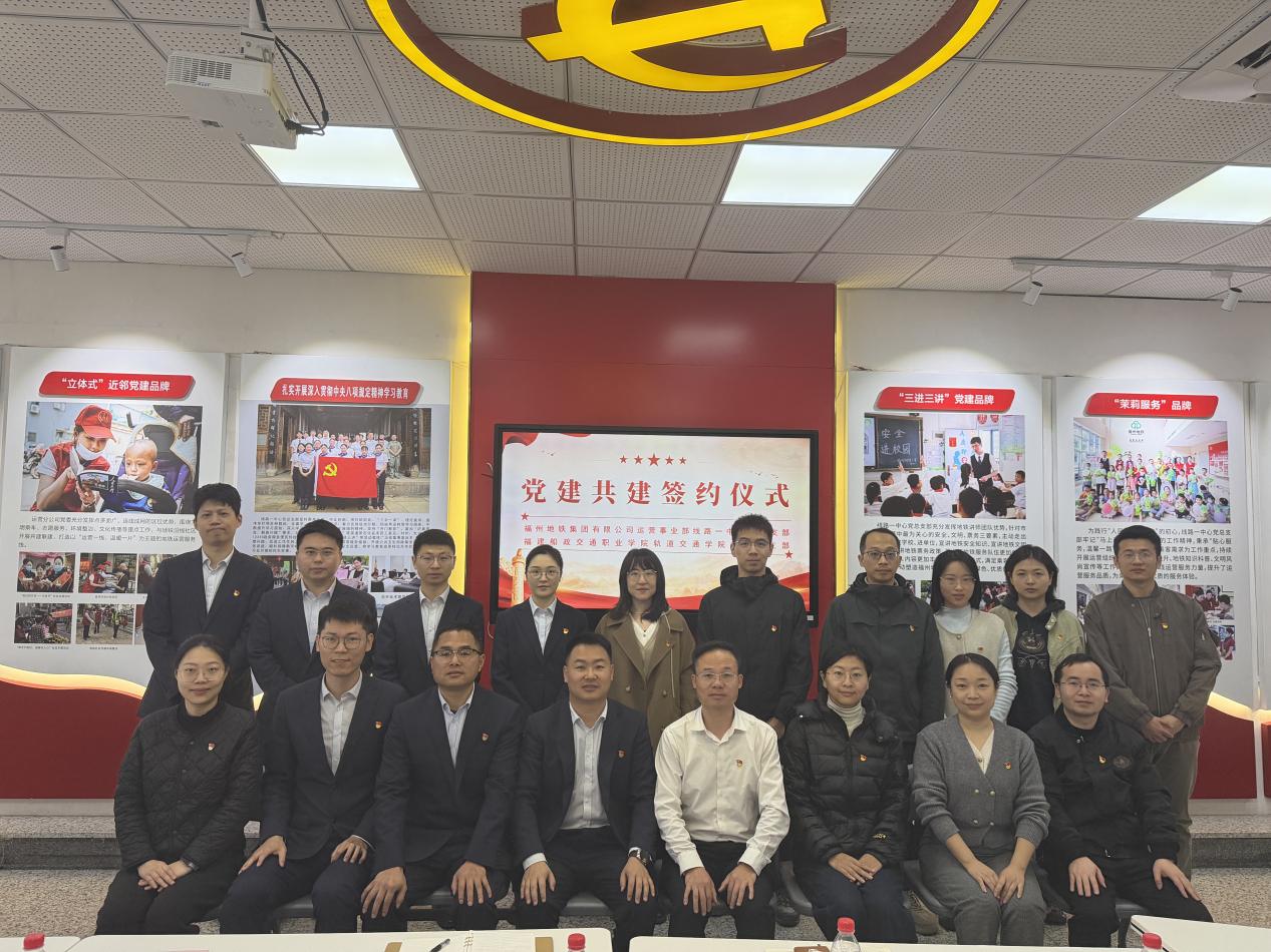 为深入推进党建与业务深度融合,搭建校企合作新桥梁,推动轨道交通领域产教融合高质量发展,2026年3月18日,福建船政交通职业学院轨道交通学院第三党支部与福州地铁线路一中心党总支支部共建协议签订仪式在福州地铁南门兜地铁站顺利举行。双方支部委员、党员代表及相关业务骨干齐聚一堂,共同见证这一重要时刻,携手开启校企党建共建、产教融合新篇章。