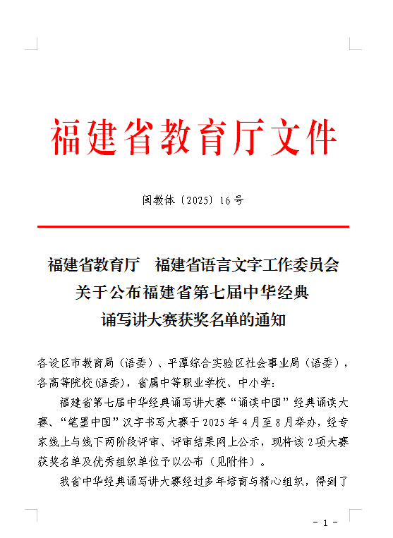 近日,福建省教育厅、福建省语言文字工作委员会联合公布了福建省第七届中华经典诵写讲大赛获奖名单,由我校教师吴婷婷、于晓凌共同指导24级汽车学院汽车制造与试验技术(3+2)1班叶文涛的朗诵作品《大堰河——我的保姆》(节选)表现优异,荣获职业院校学生组省一等奖,并获得该比赛国赛的入场券。