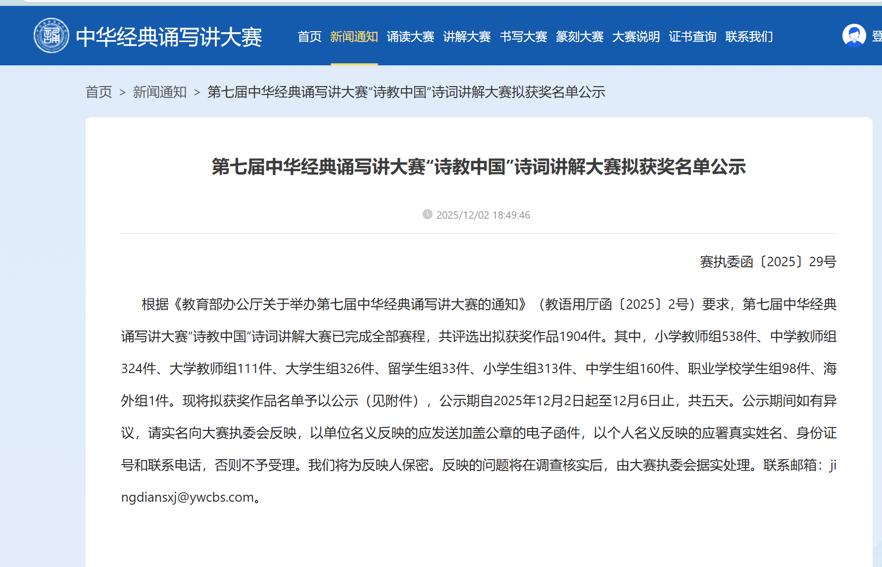 本届大赛由教育部、国家语委主办,以“典耀中华,赓续文脉”为主题,是全国性语言文化传承标杆赛事。我校学生叶文涛的参赛作品选取艾青经典诗作,通过散文化的自由句式与真挚情感表达,既展现了旧中国劳动妇女的苦难与坚韧,又传递出对母爱与土地的深情礼赞,契合大赛“体悟文化内涵、激发文化自信”的宗旨。备赛过程中,指导团队深挖作品背景,结合艾青1933年狱中创作的时代语境,通过声韵调控、情感层次铺陈及背景视频的意境烘托,最终以6分钟高清视频形式呈现,并在现场比赛中获评委高度认可。