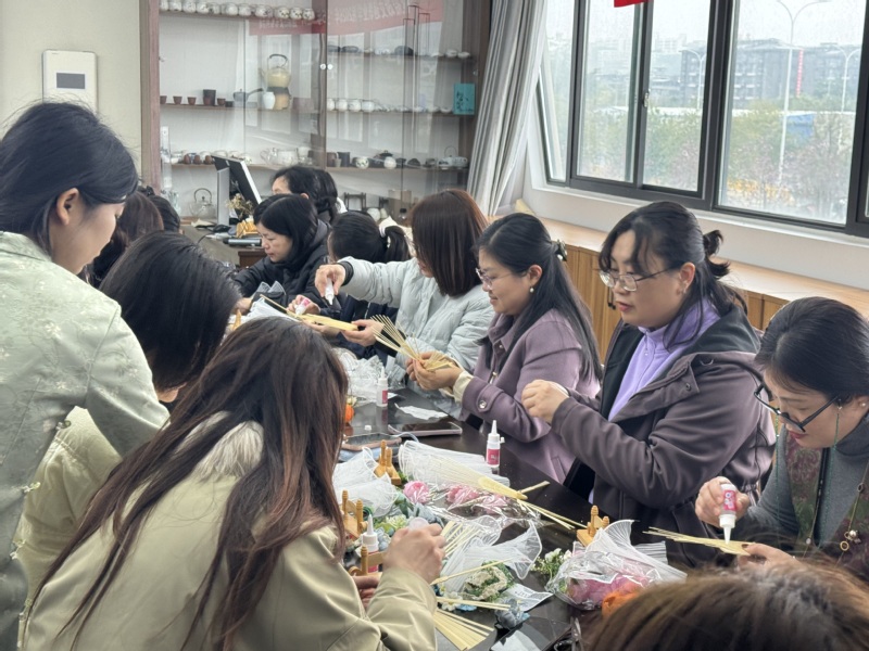 “百六芳华・簪花折扇”DIY 瞬间得到女教职工们的关注。素扇、仿绒花、缠花材料一一摆开,大家化身手工达人,凝神构思、巧手创作,将一朵朵精致小花缀于扇面,素白折扇变身独一无二的专属艺术品,指尖生花的同时,更邂逅了传统美学的温柔。