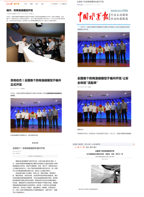 8月8日,由福州海事局和福建船政交通职业学院精心打造的全国首座防商渔碰撞馆在福船园正式开馆,获得人民日报、中国水运报、东南网、新福建、福州晚报等主流媒体报道。本次活动主要情况报道如下: