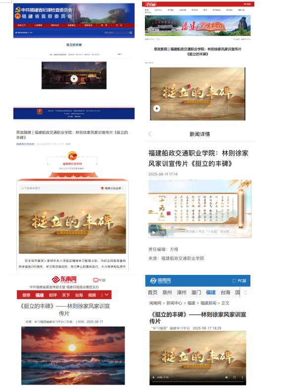 为深入学习贯彻习近平总书记关于注重家庭家教家风建设的重要论述,在全党开展深入贯彻中央八项规定精神学习教育之际,由福建省纪委监委驻省教育厅纪检监察组、林则徐基金会指导,我院纪委倾力打造的林则徐家风家训宣传片《挺立的丰碑》,被福建省纪委监委网站、学习强国、新福建、福建高校思政网等主流媒体平台刊播。