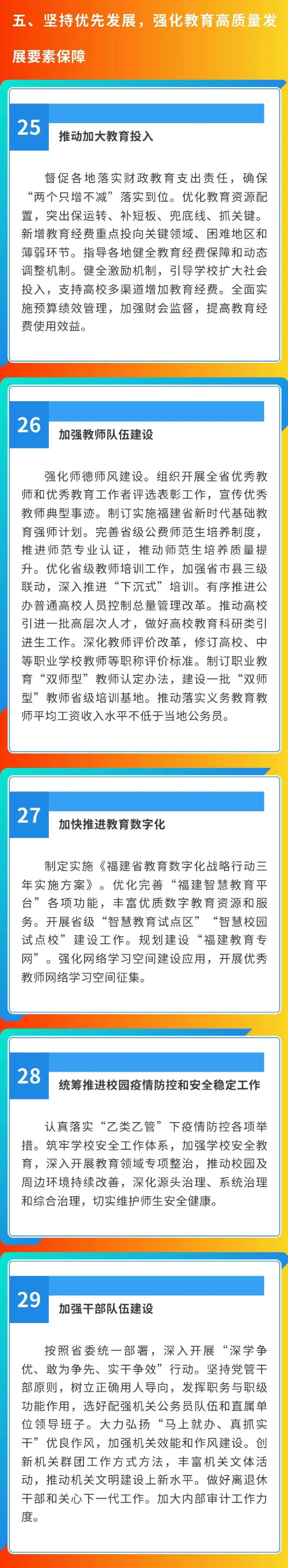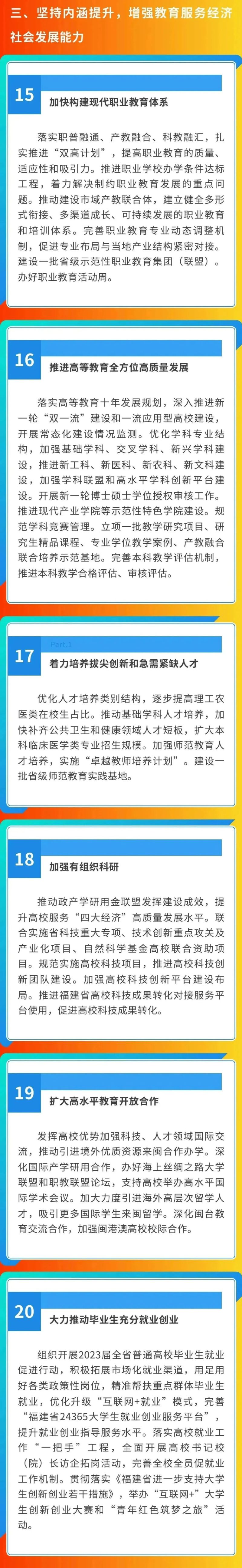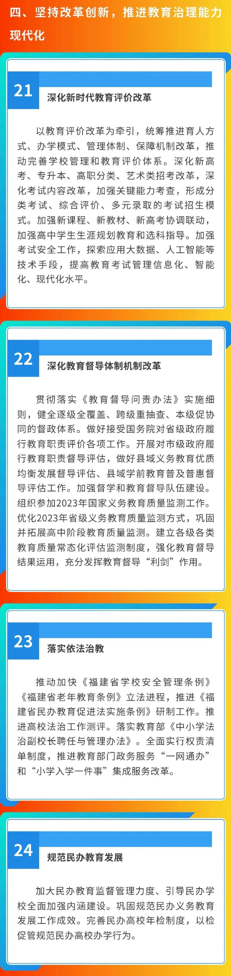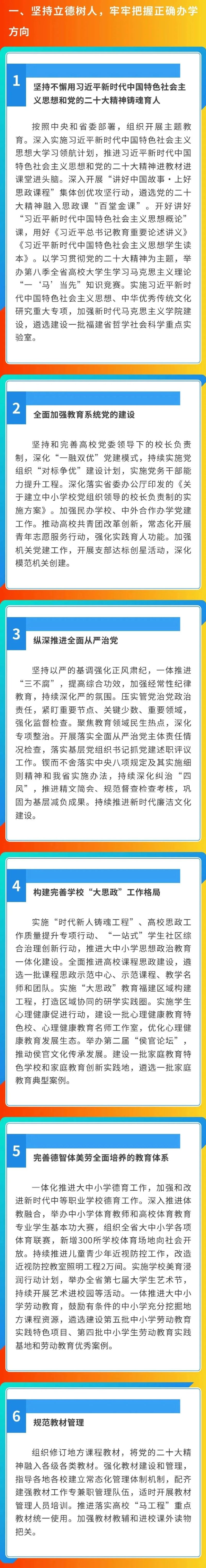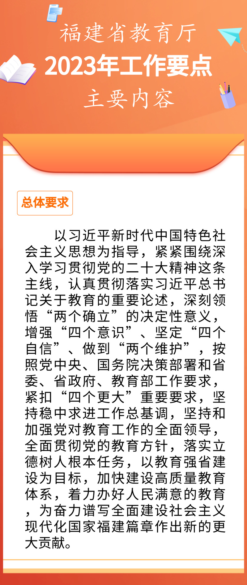 日前,福建省教育厅2023年工作要点印发,提出5个方面29项工作要点。主要内容如下: