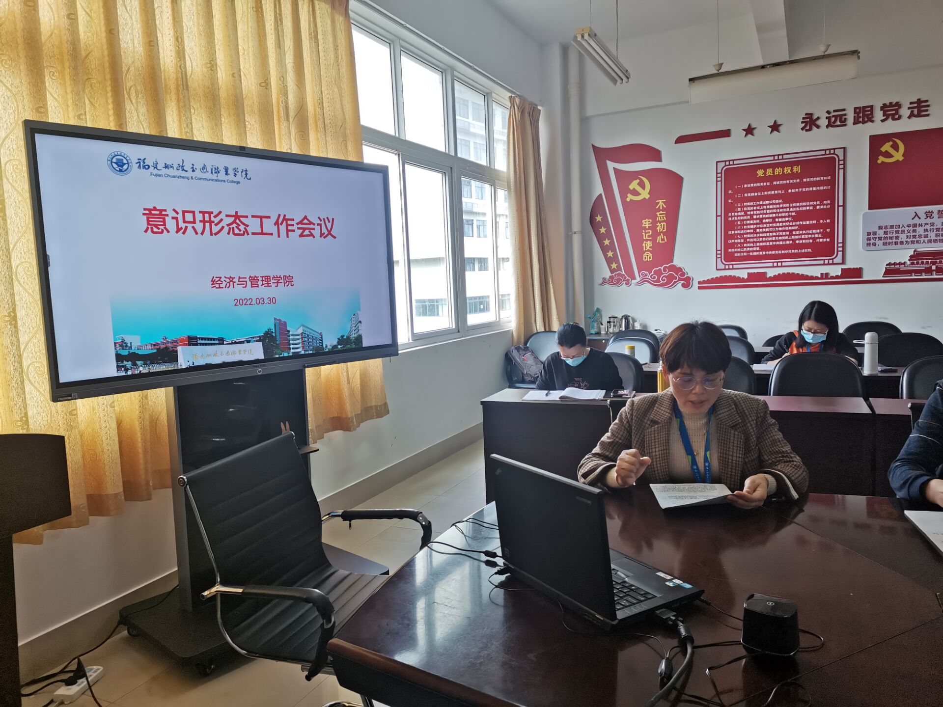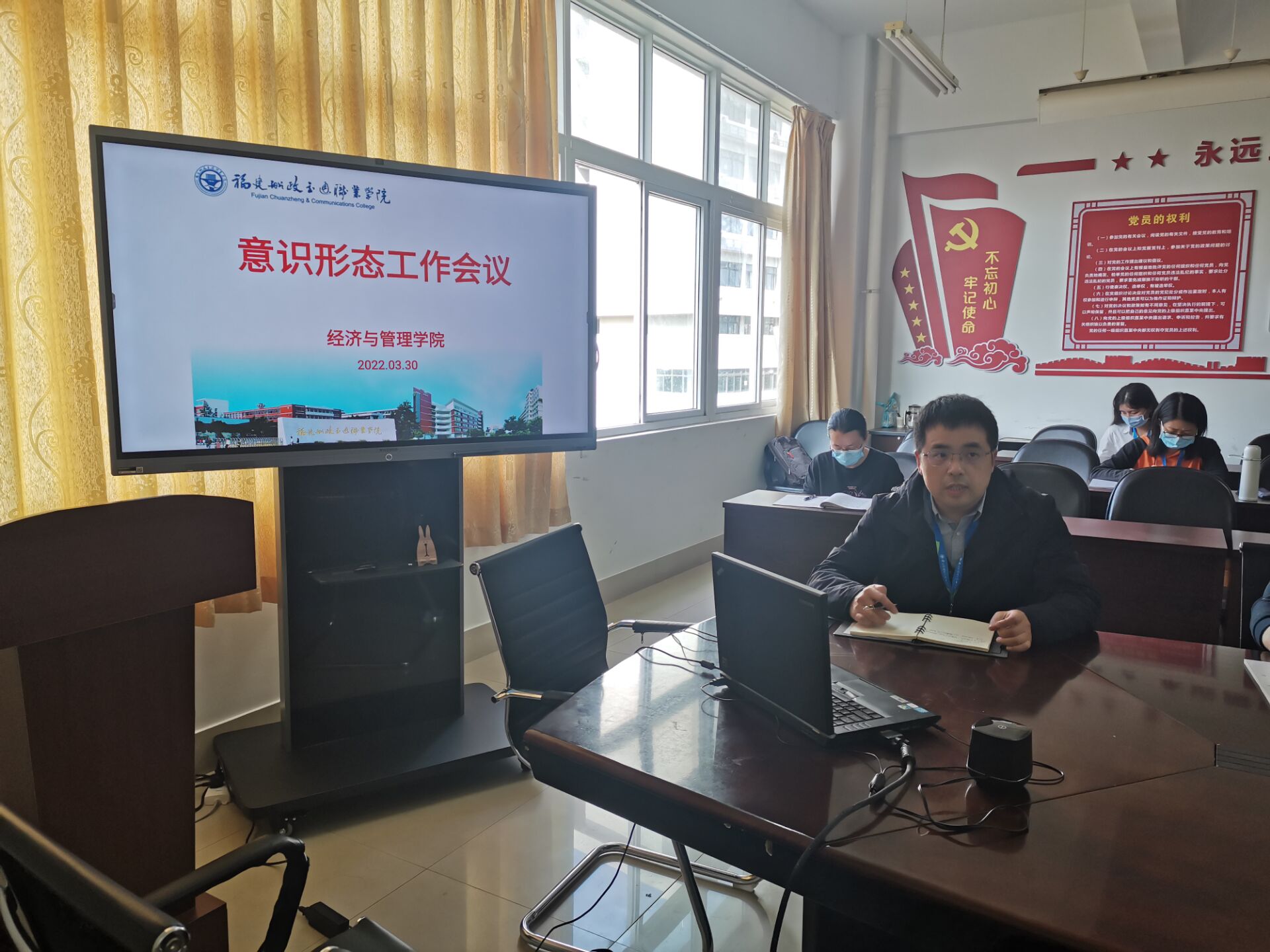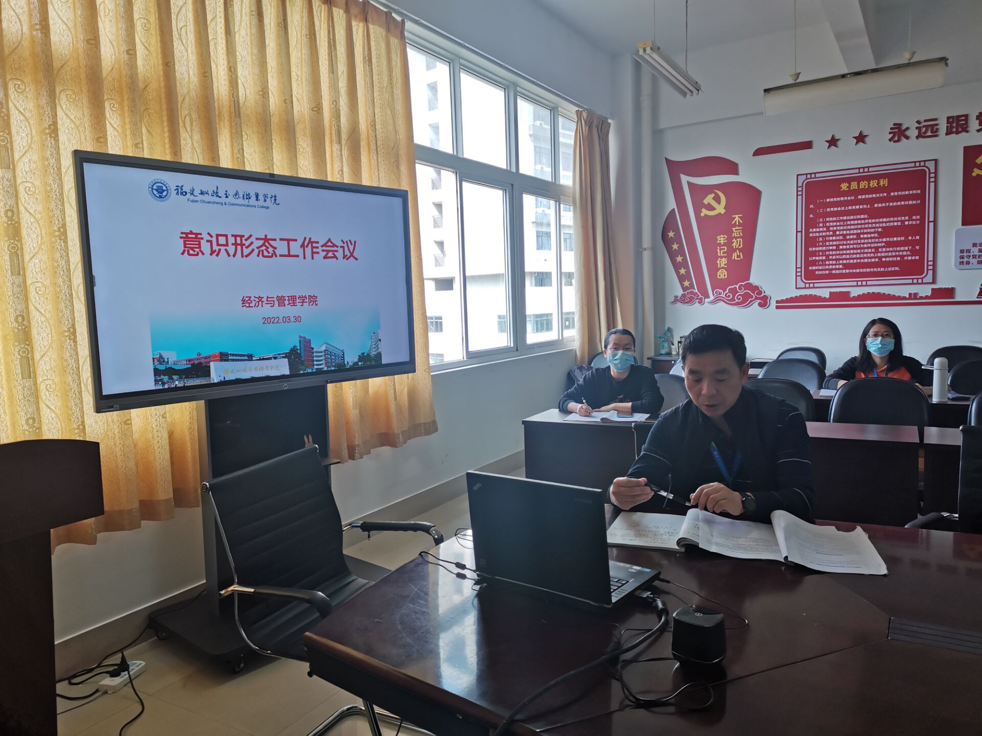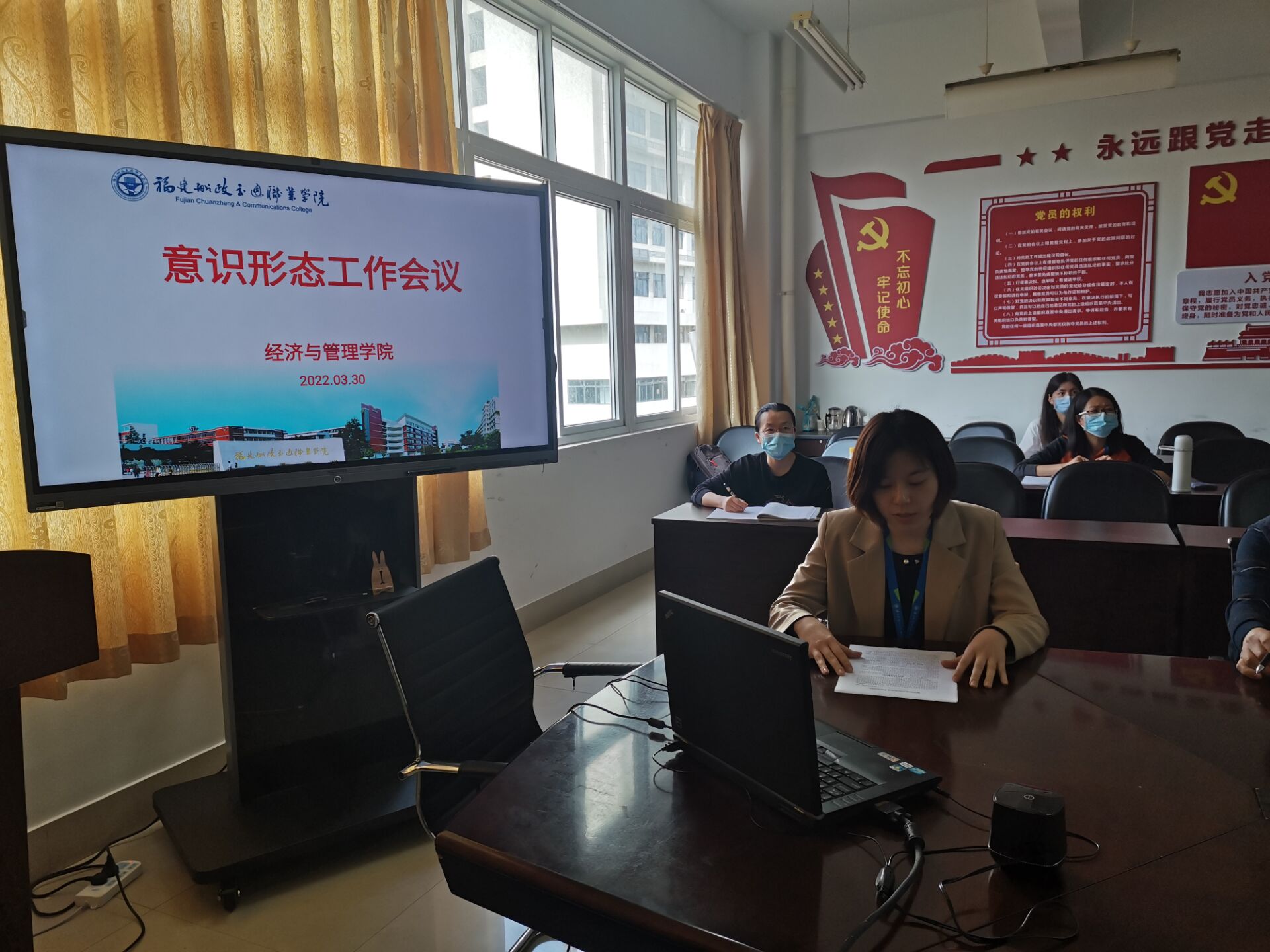 为进一步深化意识形态工作认识,全面部署2022年意识形态工作,落实意识形态工作责任制,推动意识形态工作深层次开展,3月30日,经济与管理学院召开2022年上半年意识形态工作会议。院领导、各教研室主任、专业带头人、骨干教师、全体辅导员、各支部书记副书记、综办主任在线上、线下参加会议。会议由院党总支书记俞素平主持。