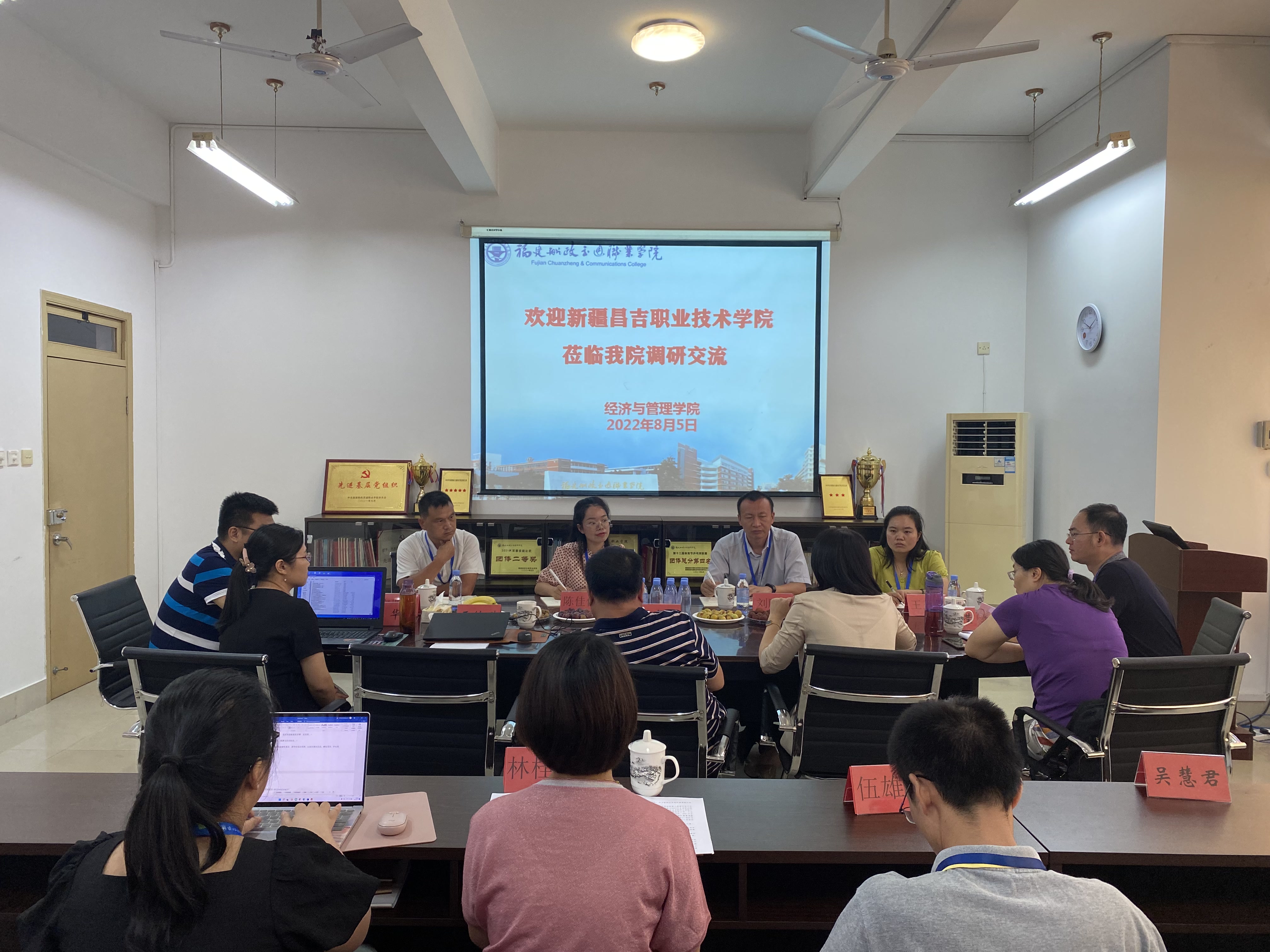 2022年8月5日上午,新疆昌吉职业技术学院经管分院刘鹏飞书记、陈佳佳副院长一行4人到我院调研交流。我院吴吉明副院长、林颖副院长、各教研室主任、专业带头人、骨干教师等出席座谈会。