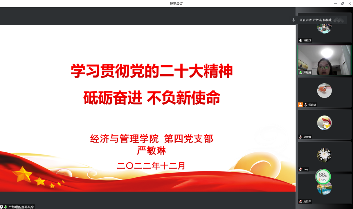 为深入学习贯彻党的二十大精神,12月2日,经济与管理学院第四党支部书记严敏琳同志在线上作题为《学习贯彻党的二十大精神 砥砺奋进 不负新使命》的党的二十大精神学习教育专题党课。经济与管理学院第四党支部全体党员参加了此次党课。