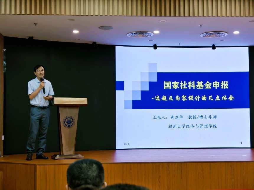 活动邀请了福州大学经济与管理学院黄建华教授作主题讲座。黄建华教授是福州大学物流研究院副院长、福建省高层次人才、博士生导师。国家社科基金通讯评审专家,福建省、湖南省、河北省、江西省等省份的自然科学基金项目函评专家;兼任教育部学位中心博士论文、硕士论文评审专家,福建省政府投资项目评审专家、福州市发改委项目评审专家;福建省应急厅应急管理专家。讲座以“国家社科基金申报”为题,为参会的博士教师们作了精彩报告。黄教授围绕国家社科基金项目的指南走向、选题原则、论证活页和申报书撰写技术细节等视角展开分享。他强调虽然国社科从课题指南发布到提交时间比较短,但中标的课题一定是一个长期思考与积累的结果。他鼓励与会教师,将个人学术研究兴趣与国家和社会发展相融合,积极申报,反复打磨,争取尽早取得突破。