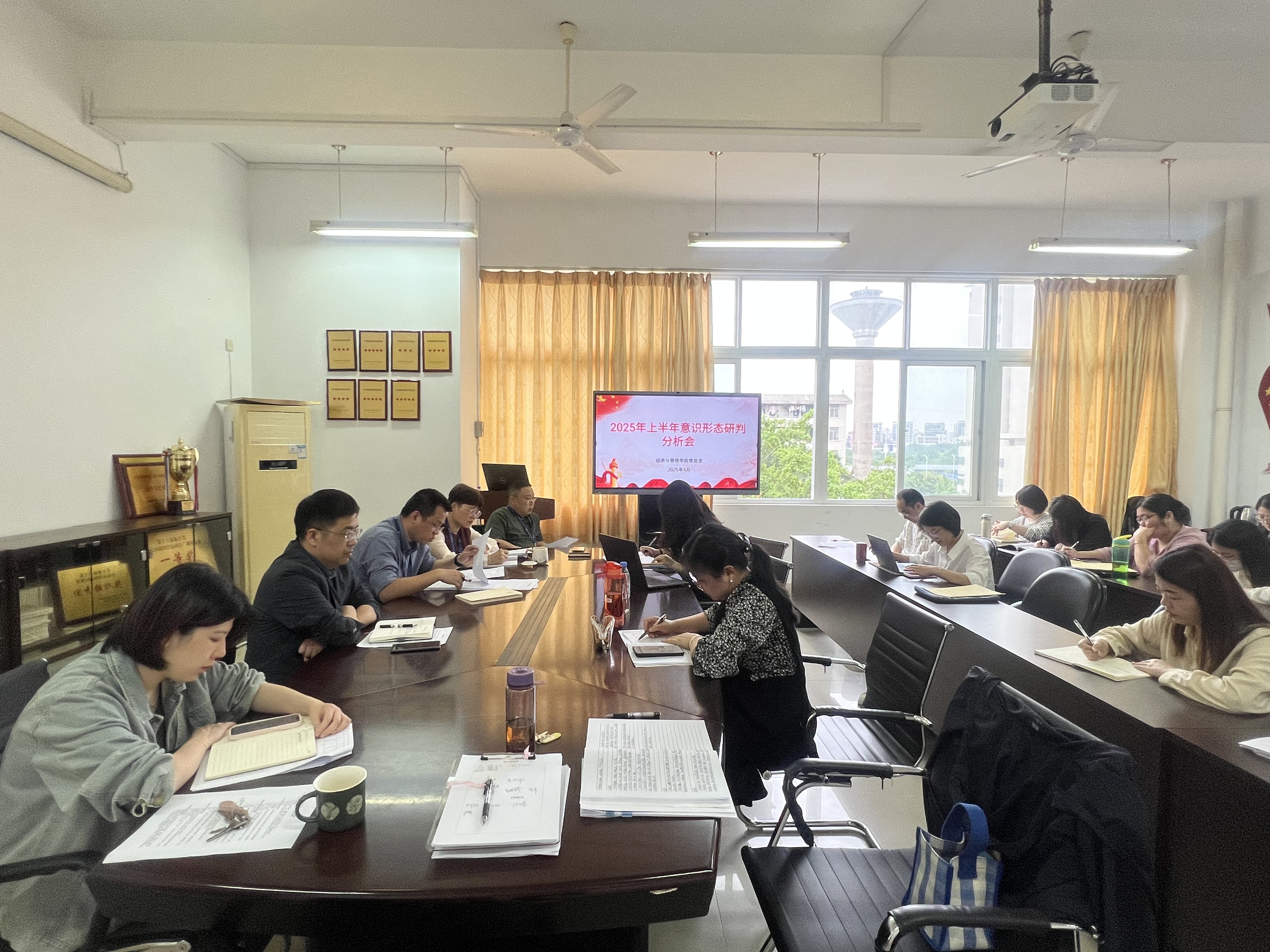 为深入贯彻落实习近平总书记关于意识形态工作的重要论述,为全面贯彻党中央、学院党委关于意识形态工作的决策部署,进一步强化风险防控意识切实加强学院意识形态工作,2025年4月23日,经济与管理学院2024-2025学年第二学期意识形态分析研判会在福船园求实楼412会议室召开。学院副科级及以上干部、各党支部书记、副书记、各教研室主任、全体辅导员参加了会议。会议由党总支副书记阮毅主持。