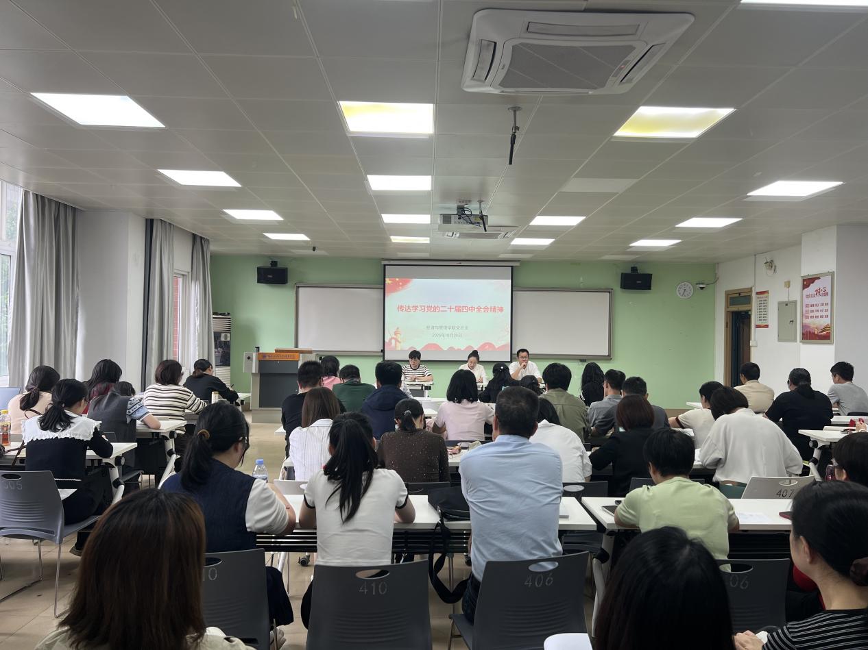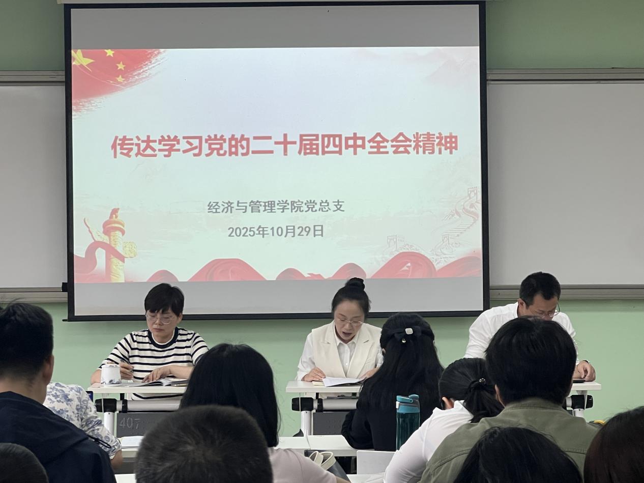 为深入学习贯彻党的二十届四中全会精神,切实把全院党员干部师生的思想和行动统一到全会精神上来,10月29日,经济与管理学院召开专题学习会,党总支书记陈慧主持会议并传达全会核心要义,全体教师参加会议。