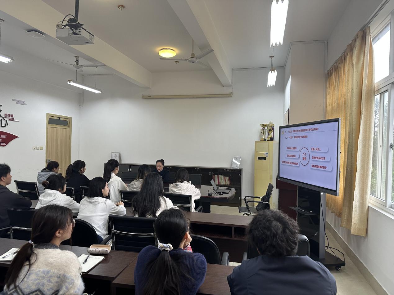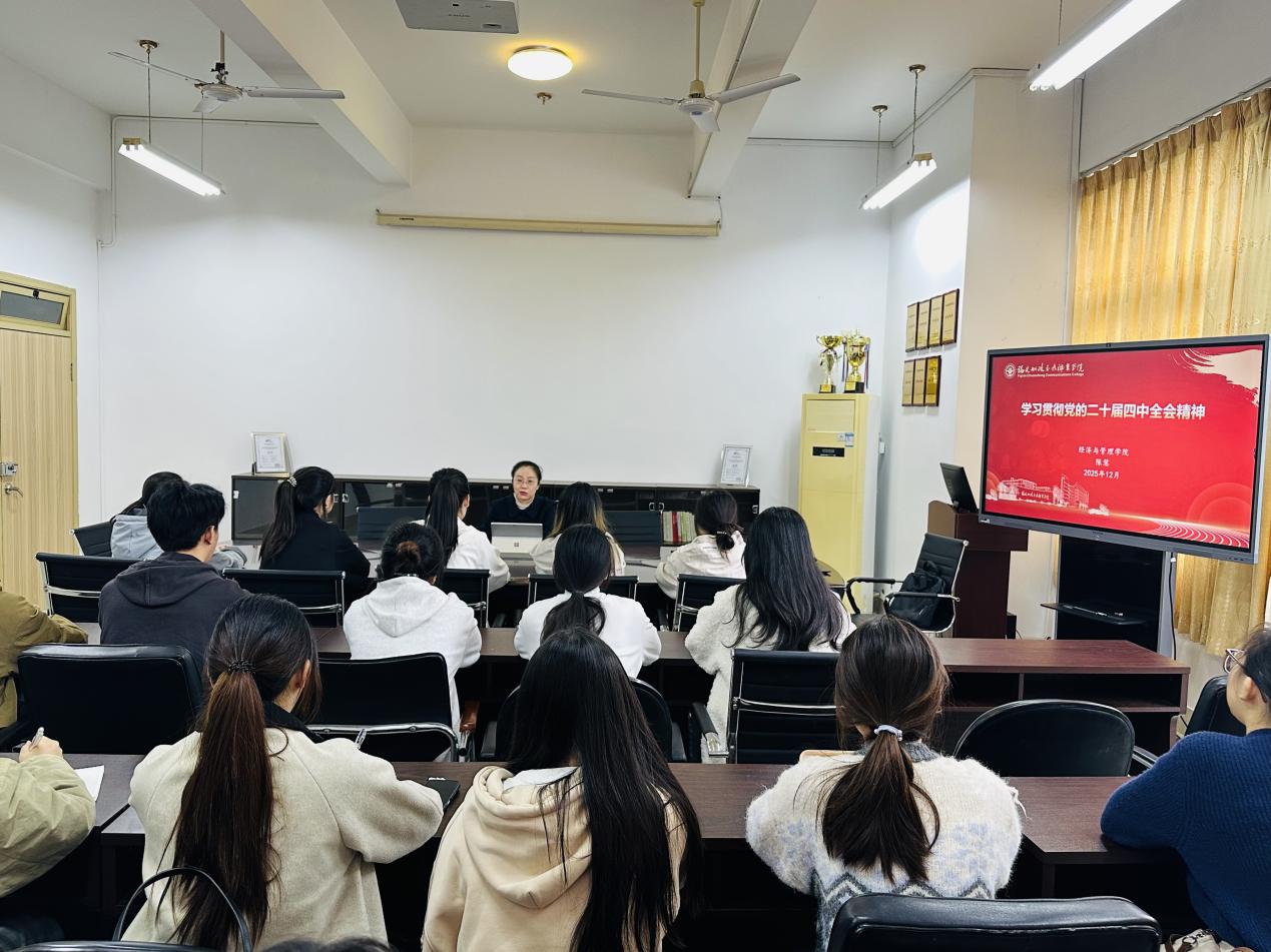 12月17日,经济与管理学院党总支书记陈慧在求实楼412开展党的二十届四中全会精神宣讲,推动全会精神在学院师生中入脑入心、走深走实。此次宣讲紧扣全会精神核心要义,系统解读了全会作为关键历史节点召开的重要意义,阐释了为“十五五”时期经济社会发展擘画的宏伟蓝图,以及《中共中央关于制定国民经济和社会发展第十五个五年规划的建议》这一中国式现代化建设纲领性文件的核心内涵。