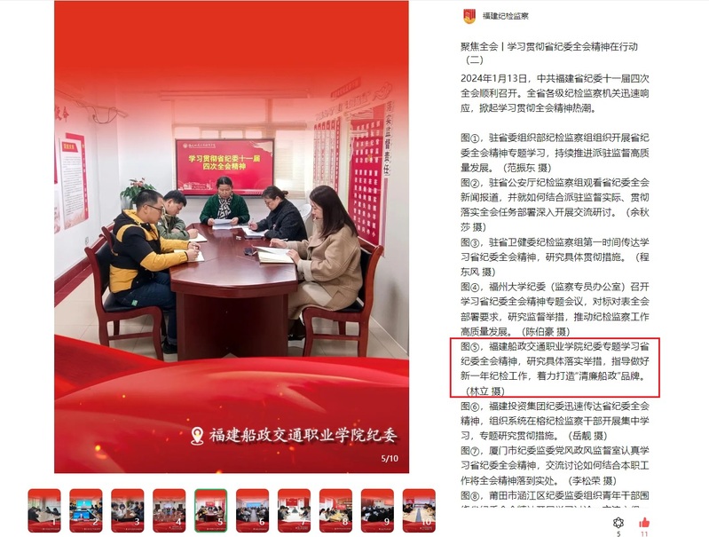 2024年1月17日,福建省纪委监委官网、福建纪检监察微信公众号报道学院纪委专题学习省纪委十一届四次全会精神,内容如下: