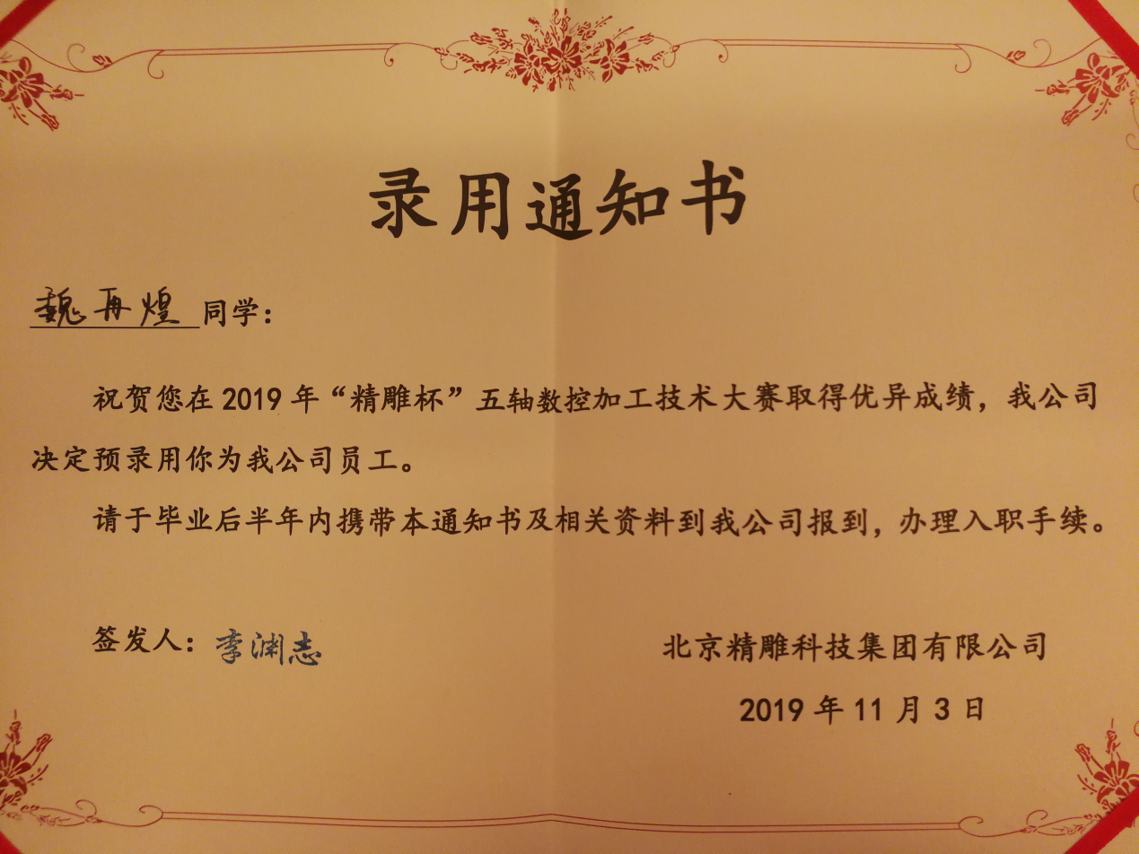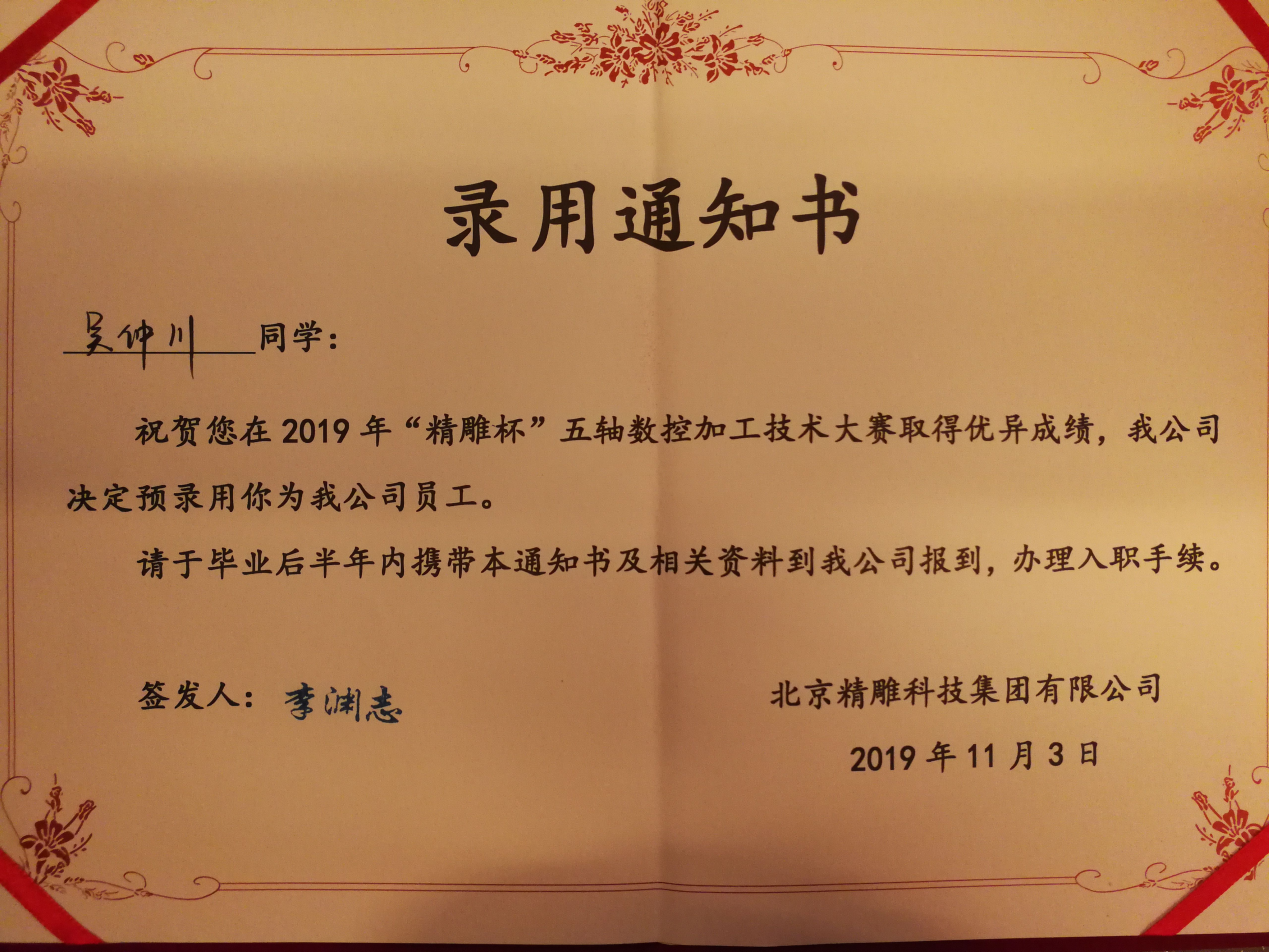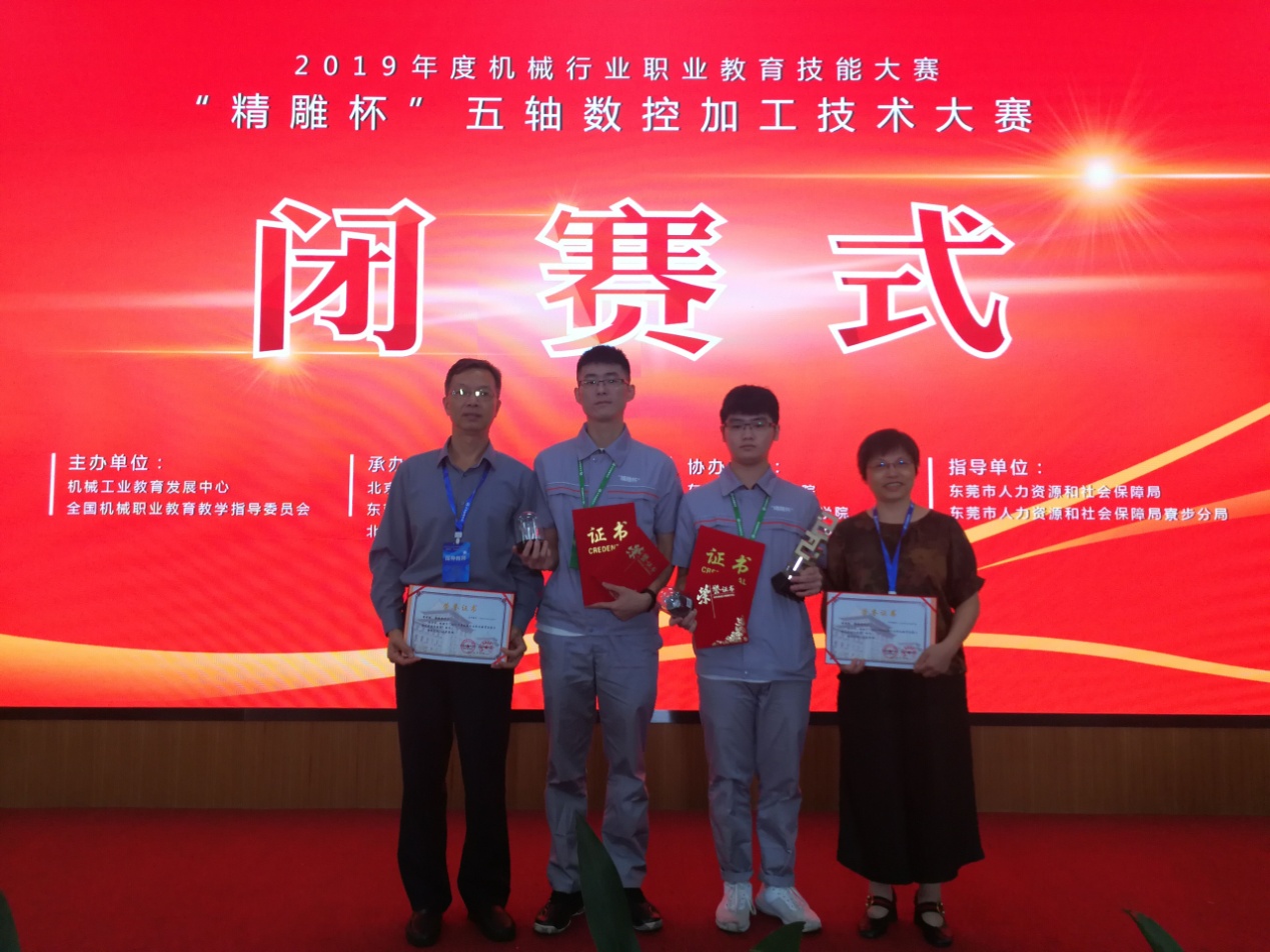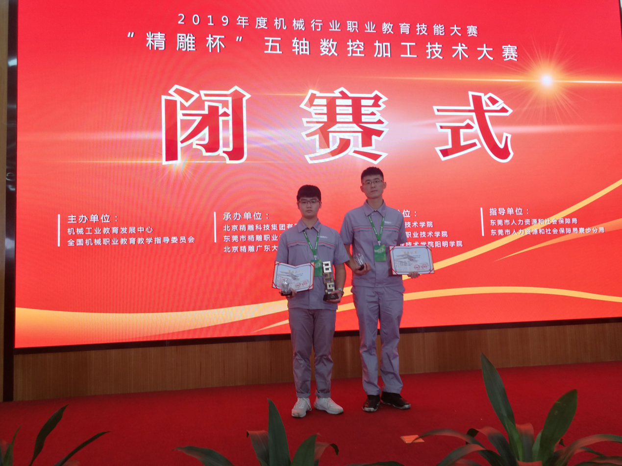 2019年度全国机械行业职业教育技能大赛——“精雕杯”五轴数控加工技术的比赛于10月31日至11月2日在广东东莞举行,我院学生吴仲川、魏再煌组成的代表队荣获全国第二名暨一等奖,指导教师李云妹、谢祖华被评为“优秀指导教师”,吴仲川、魏再煌两位同学凭借娴熟的技能和优异的表现直接被北京精雕科技集团有限公司录用,毕业后可直接前往北京办理入职手续。