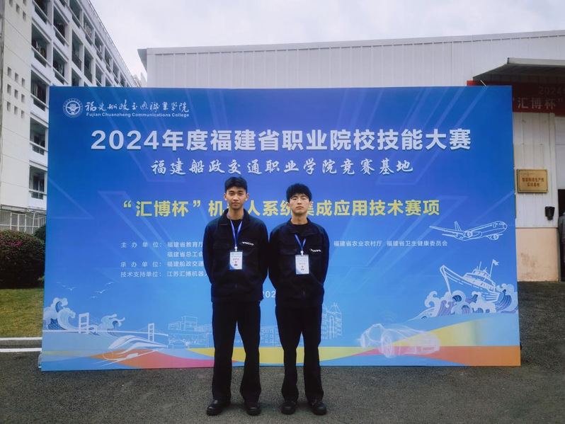 2023年12月8日--12月10日,福建省职业院校技能大赛“机器人系统集成应用技术”赛项在福建船政交通职业学院举行,来自全省18支代表队参赛。经过紧张激烈的比赛,我校机械与智能制造学院杨开怀、童晓薇两位老师指导的陈育凯、陈世卫同学获得团体赛一等奖。