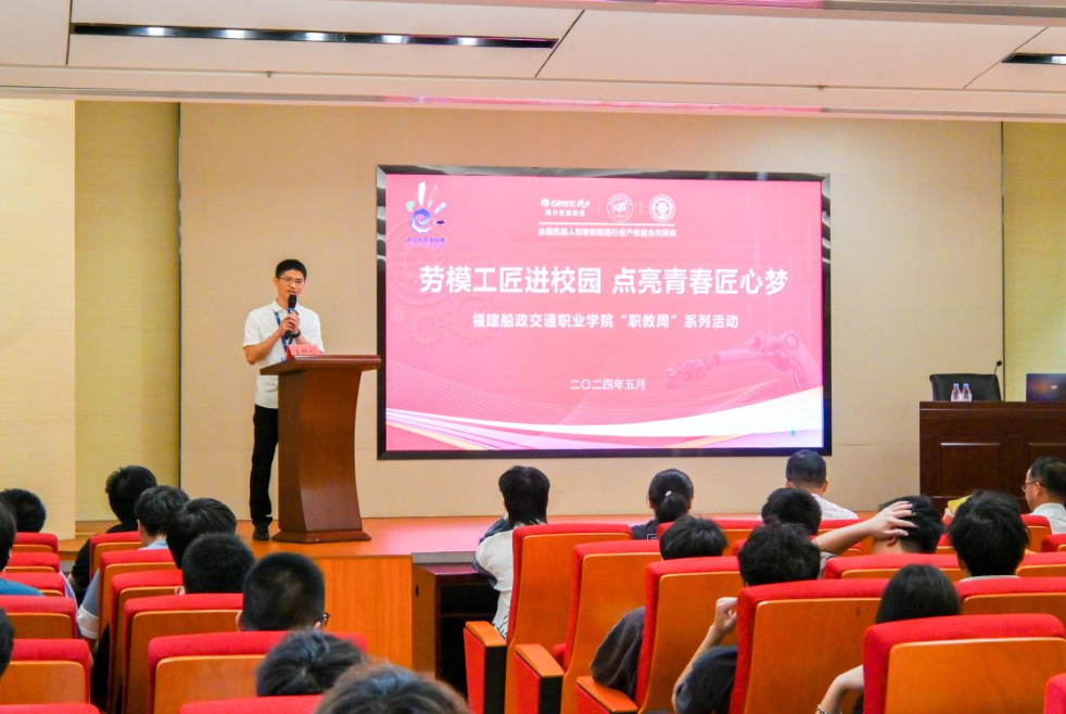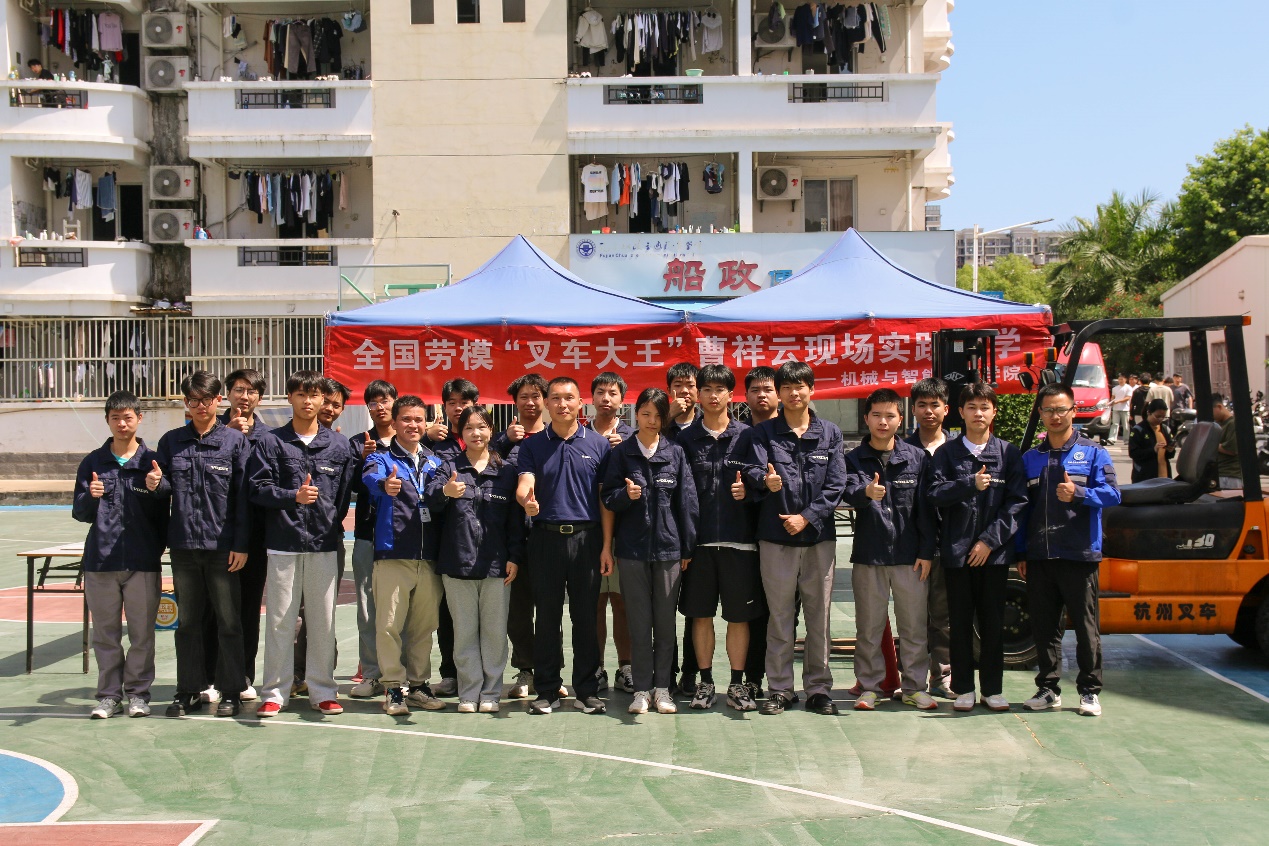 为深入贯彻落实习近平总书记关于职业教育的重要讲话和重要指示批示精神,全面落实立德树人根本任务,大力培养高素质技能人才,充分发挥劳模工匠在职业教育中的精神感召和教育榜样作用,5月17日,福建船政交通职业学院机械与智能制造学院举办了“劳模工匠进校园 点亮青春匠心梦”——职教周系列活动。活动邀请了全国技术能手——珠海格力电器股份有限公司设备科班长李永民及劳模“叉车大王”——珠海格力电器股份有限公司叉车驾驶员曹祥云两位优秀劳模典范和工匠大师,活动由机械与智能制造学院副院长曾思通主持。