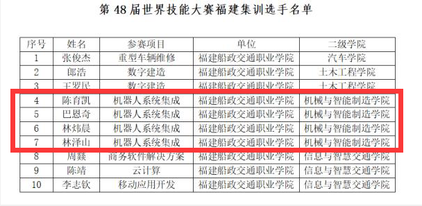近日,福建省人力资源和社会保障厅公布第48届世界技能大赛福建集训基地评选结果,机械与智能制造学院1个竞赛基地成功入选福建集训基地,4名选手入围福建省集训队。这一突破充分展现了我院在技能人才培养方面的卓越实力,是学院深化产教融合、创新技能育人模式的成果缩影。