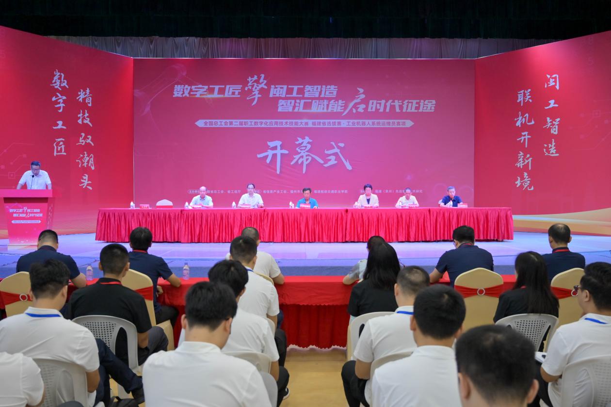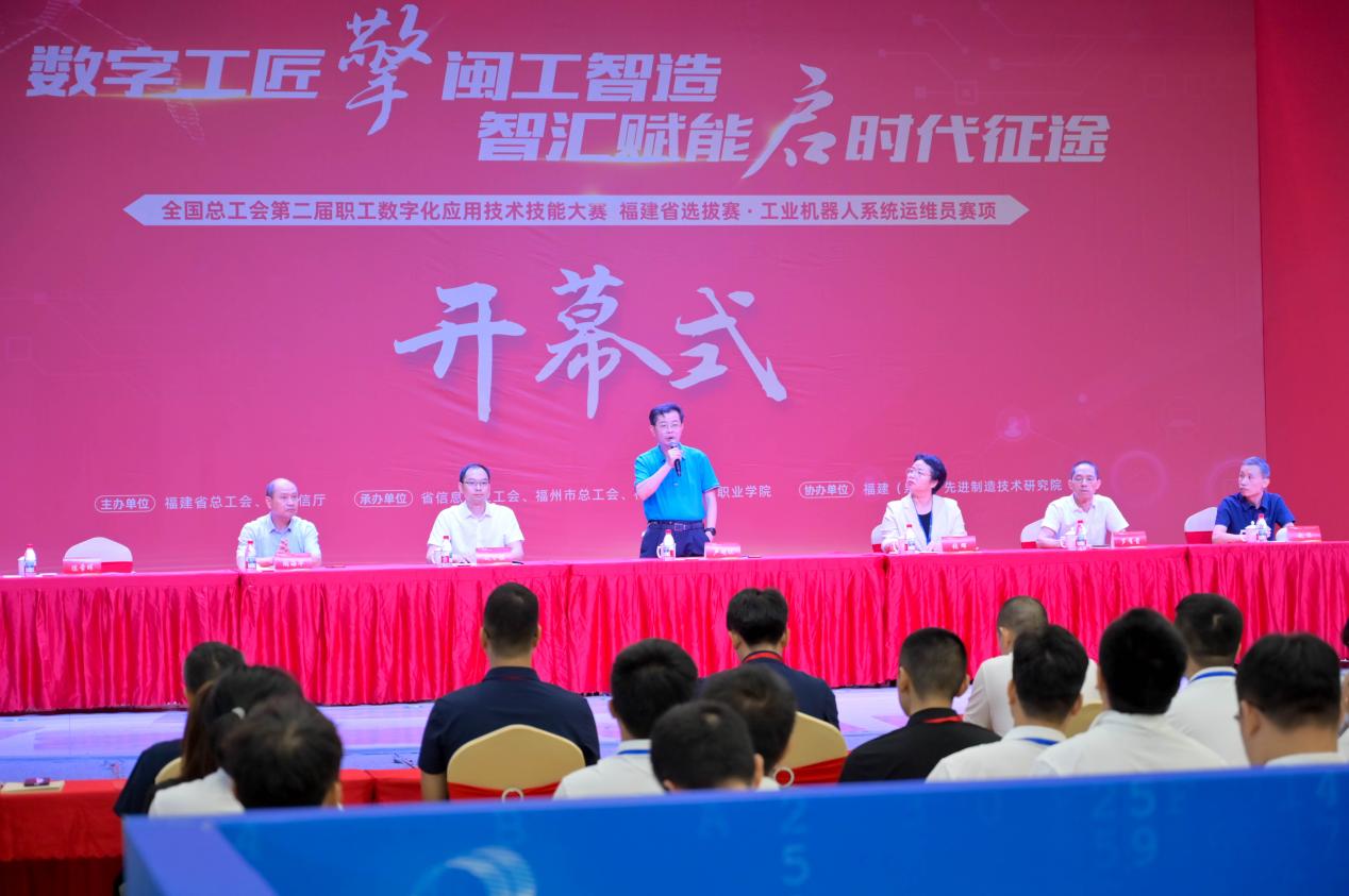 2025 年 8 月 22 日,全国总工会第二届职工数字化应用技术技能大赛福建选拔赛-工业机器人系统运维员赛项在福建船政交通职业学院正式拉开帷幕。此次赛事是贯彻落实党中央关于推进数字经济、数字中国建设重要要求的具体实践,旨在提升职工数字技能,助力产业数字化转型。福建省总工会党组成员、经费审查委员会主任、一级巡视员卢明琪,福建船政交通职业学院党委副书记、工会主席张辉,福建省信息产业工会二级调研员罗有贵,福州市总工会党组成员、四级调研员陶海华出席大赛开幕式,大赛裁判组、技术保障团队及所有参赛选手参加开幕式。开幕式由福建船政交通职业学院副院长陈常晖主持。